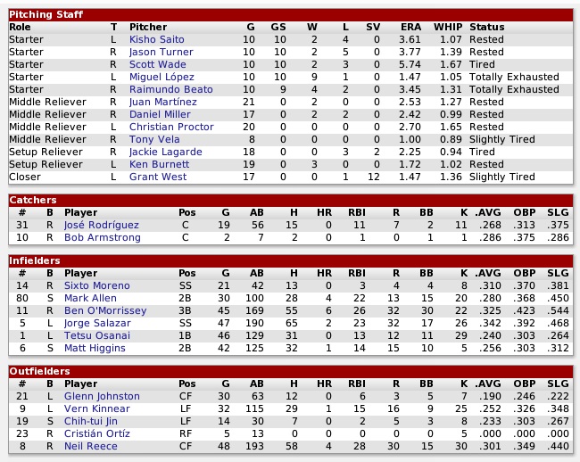 And the injury report, our constant friend and companion: Bobby Quinn was hurt on a defensive play in the game. He will miss three to four weeks with a sprained ankle. The organization is running out of outfielders… No less than six of them are on the DL for a variety of calamities. We could not call up an outfielder here, so went with an infielder. 1B Esteban Baldivía, despite not hitting a lot after being hurt early in April, was called up to audition for up to two weeks. Whether I was enjoying him batting .182 or not, Glenn Johnston was now the everyday starter in right, because he at least brought defense out there, which Chih-tui Jin, our lone spare outfielder now, didn’t.