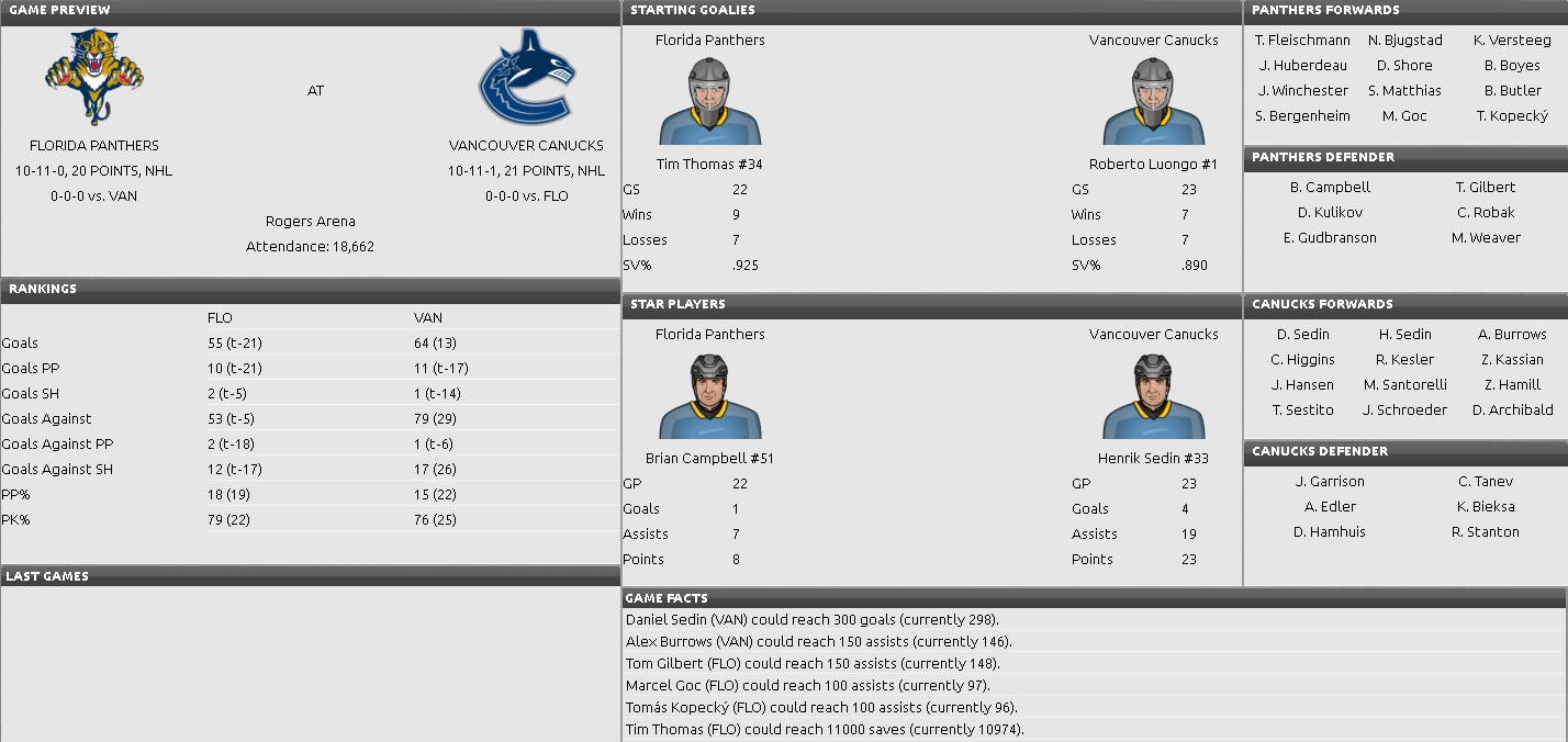 The team is advised by Coach Pauwelyn that the top line of LW Sedin/C Sedin/ RW Burrows plays the most ice time and the second line and third lines are switched up per the Canucks coaches whim. Their defense is solid and so far has no player substitutions - so keep leaning on the defensemen! Tire them out!