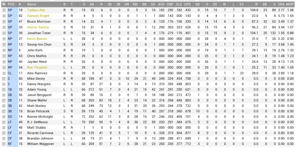 POR: CF Carmona – RF Petracek – 3B Walter – LF DeWeese – C Denny – SS McKnight – 2B Bergquist – 1B A. Young – P Toner