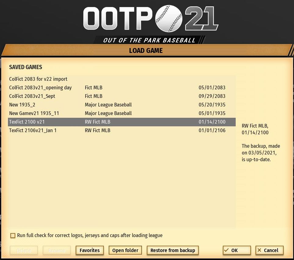 In OOTP you cannot save and backup at the same time. They are separate functions that use different folders in the tree. In OOTP you don't click on saved games, you click on "load game" and get this.