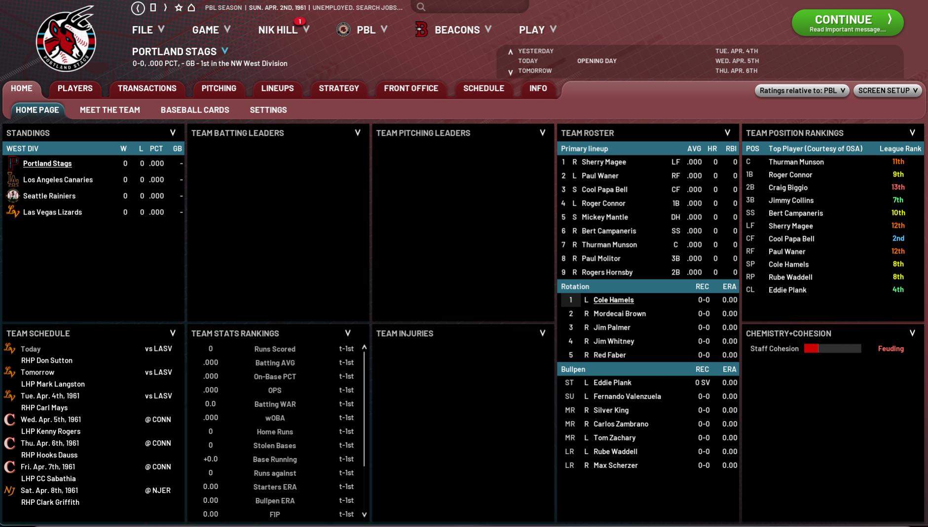 Portland on paper looks to have a squad that will start OK and then steadily improve over time to be one of the league’s powerhouses. Whether or not this comes to pass is almost certainly up to how their staff performs. Besides Scherzer and Valenzuela, it lacks any bona fide superstars but still has plenty of workhorses such as Palmer, Waddell, Three-Finger Brown and Hamels – guys who in any other league would be among the best but who might struggle in this All-Star calibre competition. No such problems among their position players, with a certain Comet from Commerce and a guy named Rogers you may also have heard of, along with Connor, McGwire, Munson, Molitor and Cool Papa Bell to name but a few. 26th Man Torres is a real wildcard and it will be fascinating to see if he can hold his own against the game’s historical elite. Two other elements in this club’s favour are their excellent defensive skills and speed, which will allow them to mix it up strategy-wise if one style of play isn’t getting them anywhere. If that pitching comes to the party, I reckon these guys will do alright.