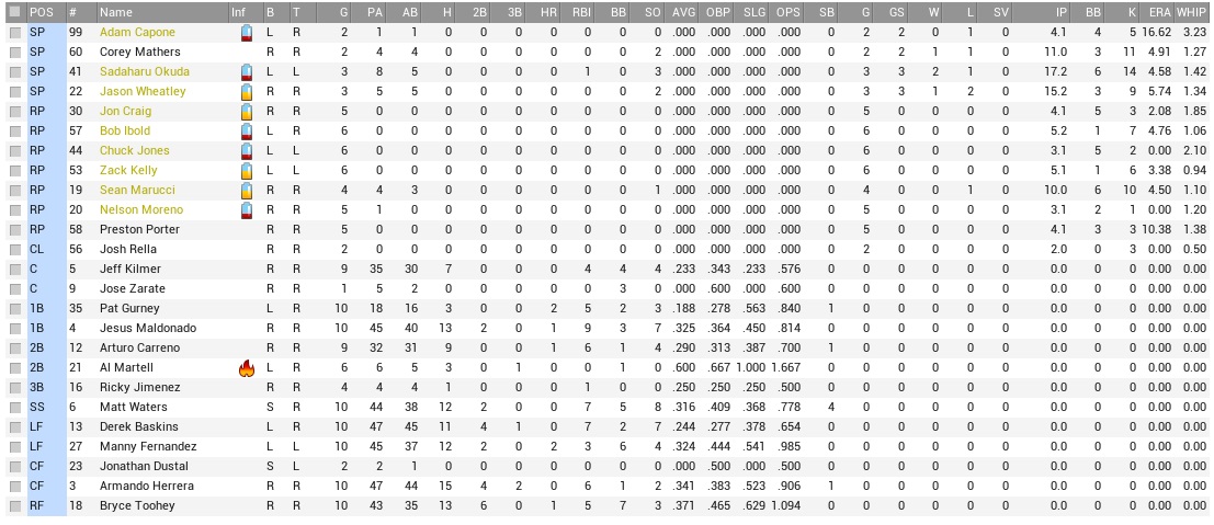 POR: LF Baskins – CF Herrera – 3B Maldonado – RF Fernandez – 1B Toohey – SS Waters – 2B Carreno – C Kilmer – P Capone