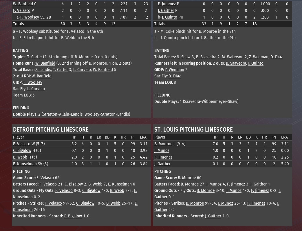 Velasco (5-7) lasted 5.2 innings, allowing no runs on four hits (all singles, all eight St. Louis hit in the game were singles) while striking out five and walking one.