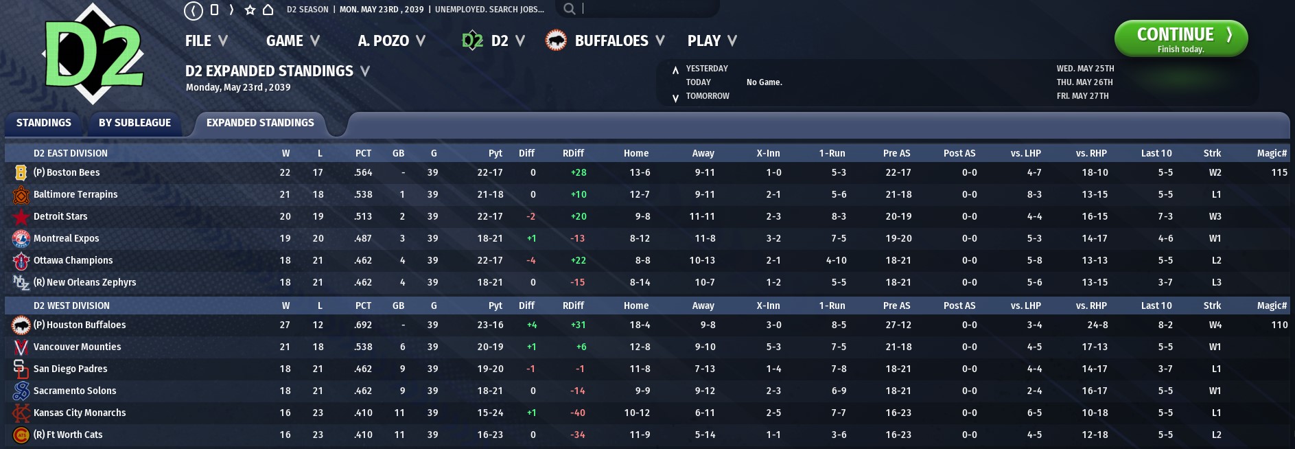 It’s still early, but the excitement in the air is real in Houston as the Buffaloes have built a six game lead on the rest of the conference. They have D2’s best run differential, and the best in the West by far at +31. Doug Frey continues to have a career year, while 26 year old catcher Justice Slaton is breaking out, with 8 homers and a .811 OPS. The rotation is the biggest weakness for this club, so look for them to start trying to address this on the trade market, especially as Vancouver seems to be heating up. The Mounties are now in second, after a 5-1 week in which they swept the Bees. Vancouver has not looked back at Rich Buxkemper, their 2038 Pitcher of the Year, once: the Mounties now have the best pitching staff in D2 with a deep, if possibly overperforming, rotation. The bullpen has been an issue though: Matt Greene has not looked like his old self yet, and only Steven Smith and Carlos Castillo have had any real success so far. After Vancouver, the West drops off fast: San Diego and Sacramento are both 18-21, and behind them are Kansas City and a very disappointing Ft. Worth team. Hector Razo has been excellent, but Ian Weaver has struggled mightily, and Jesse Moeller’s immense skill still haven’t translated into solid 2039 results.