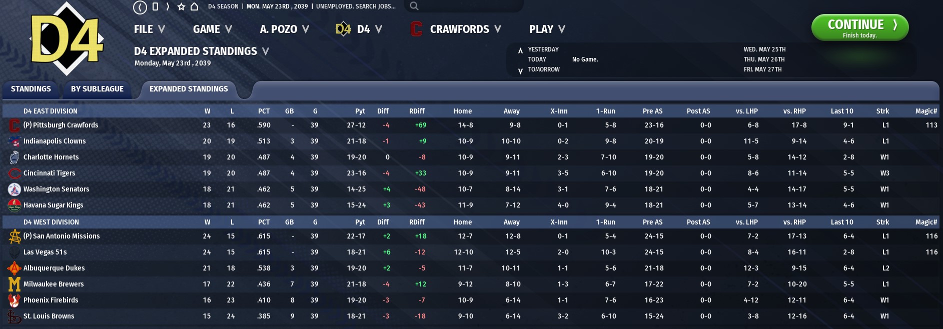 The Pittsburgh Crawfords are in business. The club ripped off a nine game win streak that ended Sunday, and they displayed unparalleled pitching dominance in doing it, allowing just 7 runs over those nine games while scoring 59. Joel Ortiz, at 23, is authoring an all-time season so far, and was 2-0 with a 0.50 ERA over his two shutouts during the streak, over which he struck out 26. But he’s not the only one contributing to D4’s best rotation: Karunamaya Nema has been locked in in recent starts, as has Chri Scott, while Matt Hahn has rebounded as well. This pitching staff is scary. They’re certainly not running away with it, though - another great pitching staff in Indianapolis is hanging three back. While Nate Mefford is having a difficult year, Aaron Cottrell has bounced back, and Greg Smith’s amazing knuckleball continues to make D4 batters look foolish. As always, though, the Clowns need bats, ranking ninth in the Division in runs. Charlotte continues to slide, and is now tied with Cincinnati at four games back, with a 19-20 record. Washington and Havana follow, each at 18-21, five games behind.