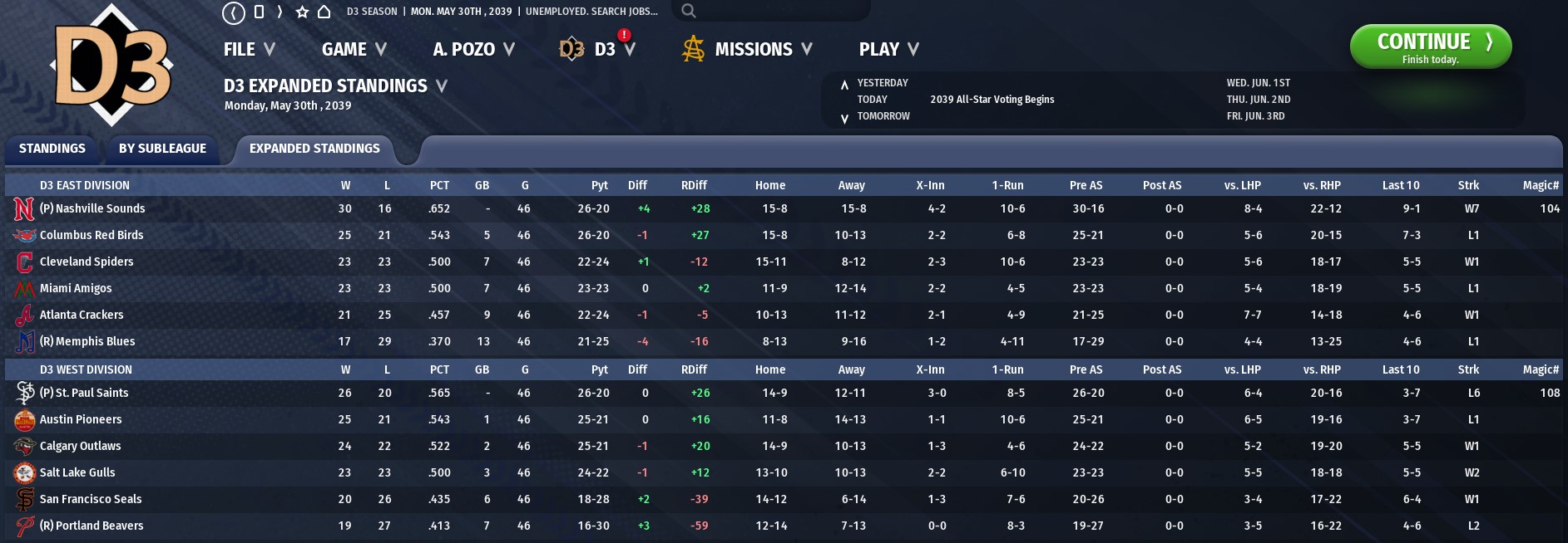 Los Angeles pulled another run up on the Conference this week, going 5-2 while finishing up a sweep of the Bears. Brian Weisman continued to wreck the ball: the best rookie in D1 is now hitting .338/.372/.623 with ten homers, at 23, while playing eye-opening defense in center. Ryan Haymes continues to lead D1 in average though his has slipped to .371, and Doug Kluz is continuing his late-career renaissance with an outstanding early season. Monterrey is now two back at 28-18, and swept Brooklyn this week, winning the finale on two solo shots in the top of the 11th. El Paso, meanwhile, surged this week with a 6-1 run behind Player of the Week Brian Castrovinci, who hit six homers over seven games while driving in about a third of the runs his team scored in that stretch. Seattle, meanwhile, has broken that 11 game losing streak, and is now tied with Tijuana and Denver at 20-26.