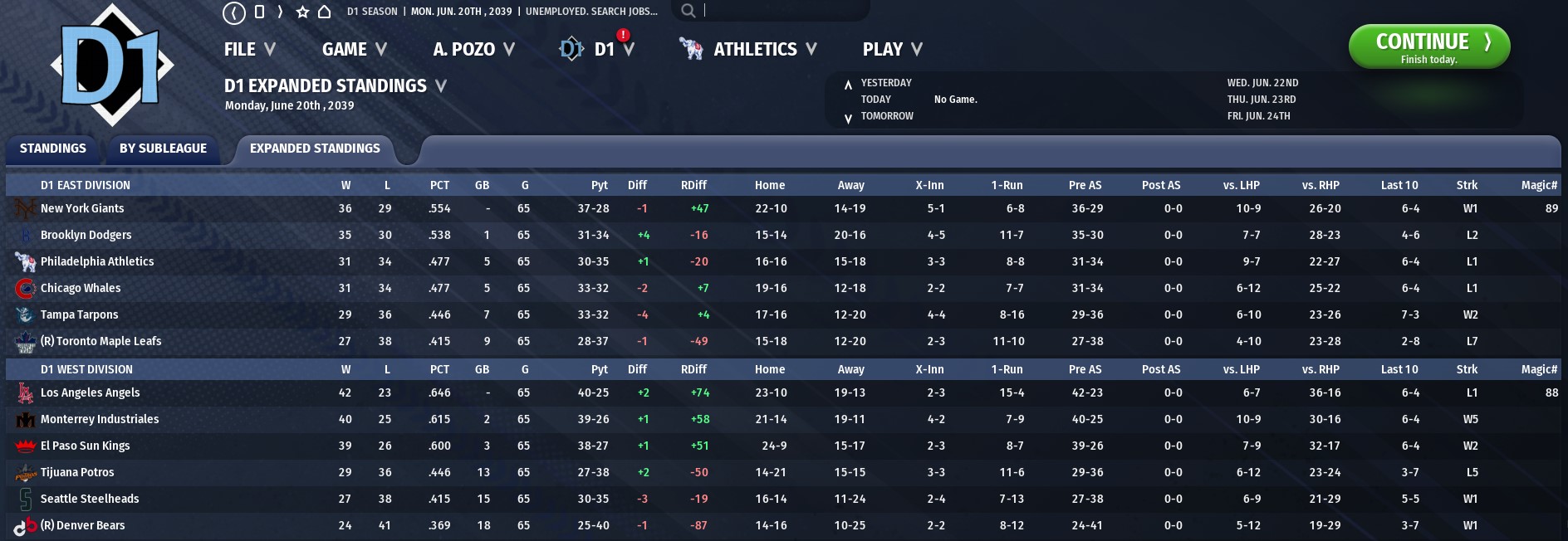The New York Giants reclaimed the top spot in the D1 East with a 5-2 week that included a critical sweep of Brooklyn. Willie Rodriguez pitched a gem in the finale, with a complete game shutout victory striking out 11, while Matt Wood came alive for New York, hitting .526 with a .571 OBP. Brooklyn, by virtue of that sweep, went 2-5 to sink a game back of the Giants, though no one can fault Player of the Week John Brucia, who celebrated his 300th career home run with five more following it, for a six homer week. Brooklyn’s week ended, though, with two straight pitching failures: a 12-16 loss in extra innings to Tampa on Saturday, and an 8-17 loss to El Paso Sunday. All other D1 teams are below .500, though the Athletics are making a bit of a move, and are now tied with Chicago for third place at 31-34, with young CF star Mike Mitchell playing a big role.