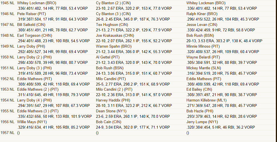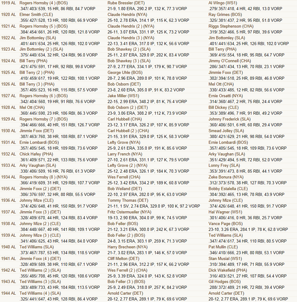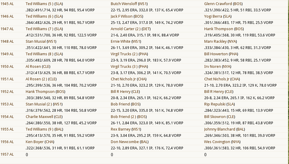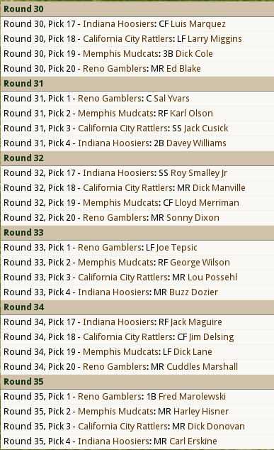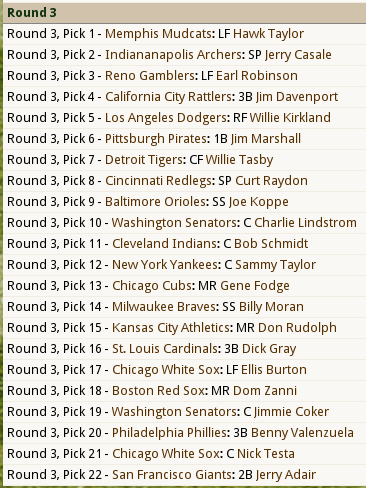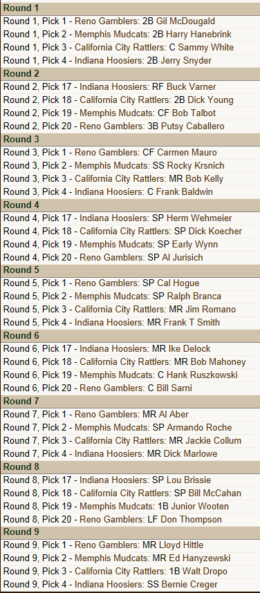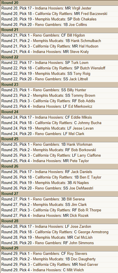 This league was started in 1871 and simmed until 1957. It has its own History separate from MLB. The ONLY thing I DID during the simming of the 76 seasons was half way through the 1919 season I changed Babe Ruth from a MR to a LF to simulate his actual career position change. I felt like I owed it to this league to give him a shot at the record books. I will be catching all of you up on the history of this league in the near future before I move onto the expansion of the league. Even before I announce the actual expansion teams. What the simming a new history accomplished is it eliminated the issue of not really having enough players to fill teams and reserve rosters adequately as there has been a draft every year. Organizational Rosters range from 56 Players ( White Sox) to 82 Players (Cleveland Indians) Plenty of players to accomplish an expansion draft without too many ill effects on the league. So expect a History update BEFORE Expansion!