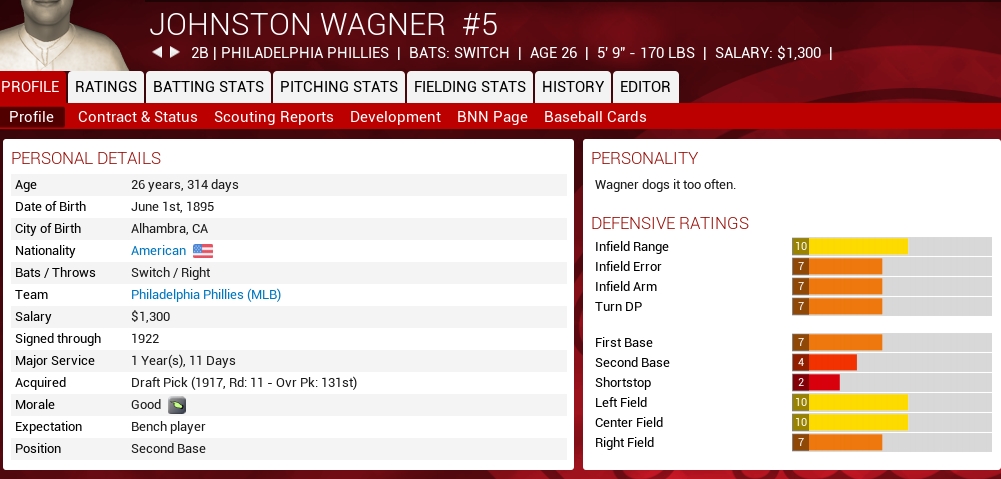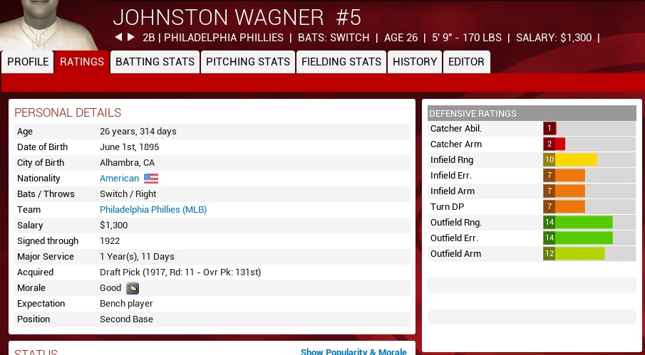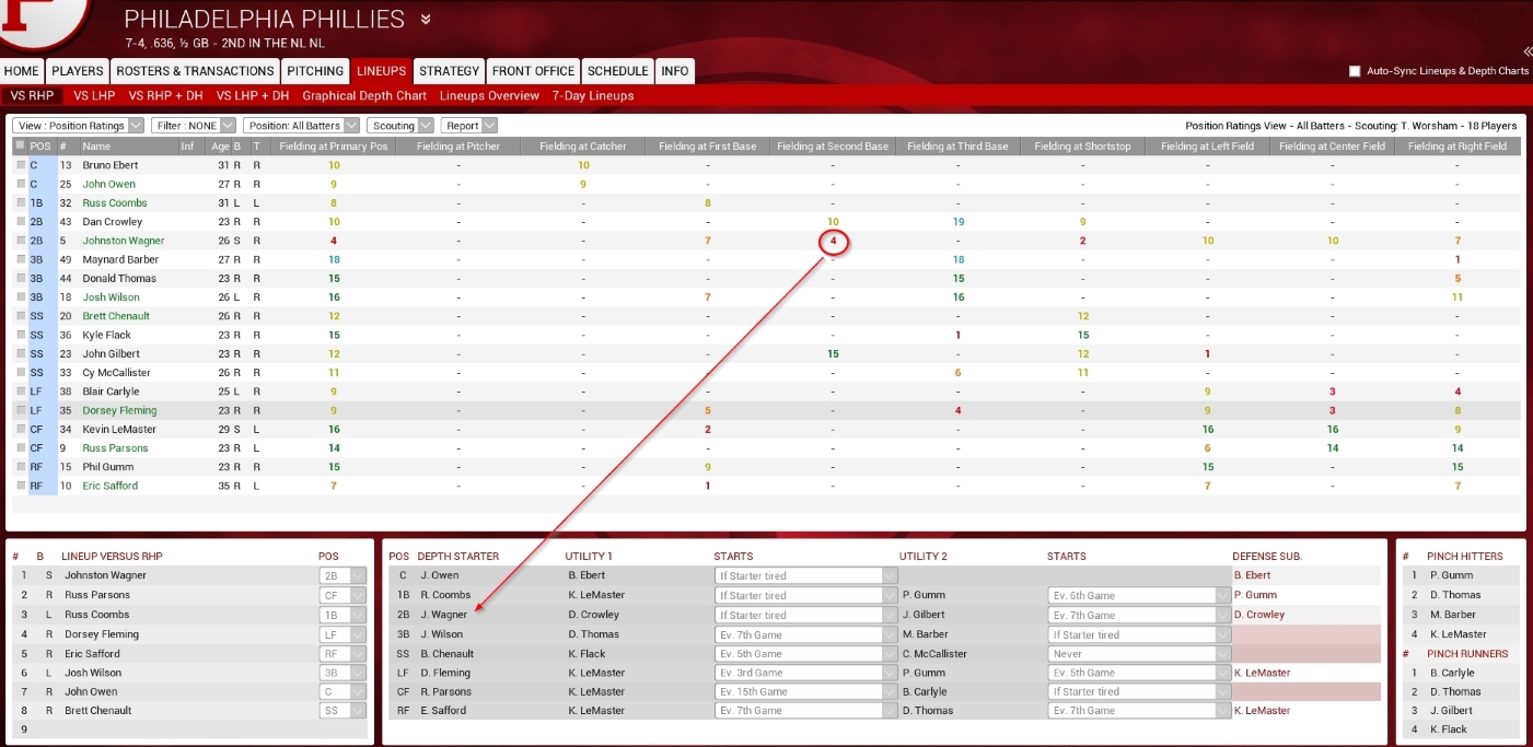 Example: starting at 3B is 1B Jim A Devlin - he is a 54 at 1B and a 34 at RF - not qualified to play 3B - no rating there The roster has Frank Norton, a 42 at 3B and Fred Waterman, a 46 C, a 59 3B, a 32 SS and 35 CF Neither player is in the starting lineup.