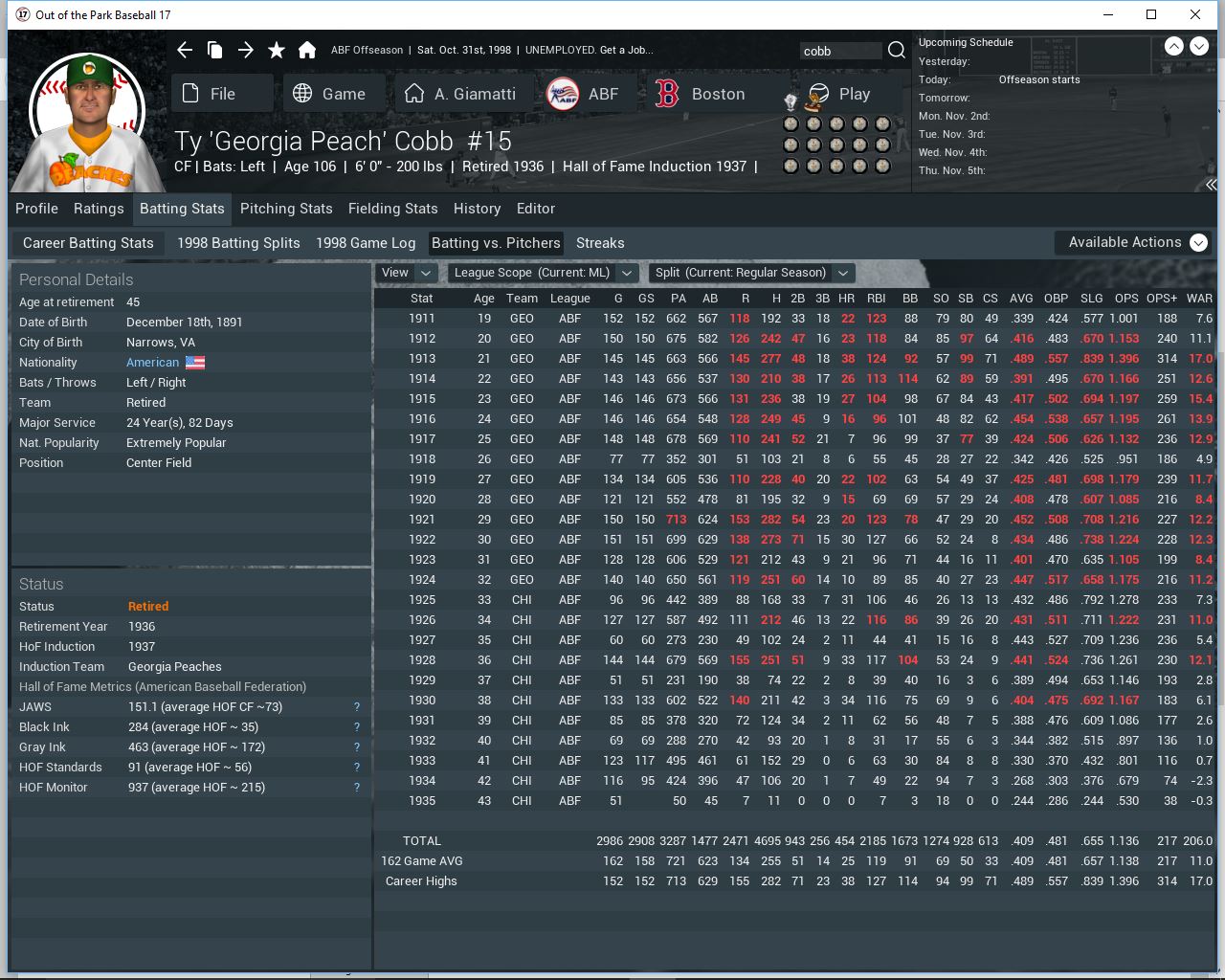 I use neutralized stats. MLB ERA in 1938 was 4.28. AL in the ABF was 4.58. Lefty Gomez went 31-10 2.68 359 IP i try to limit how many real players i import each year but their were many real MLB stars in the league at the time. Fictional players tend to be worse then MLB for offense but better for pitching.
