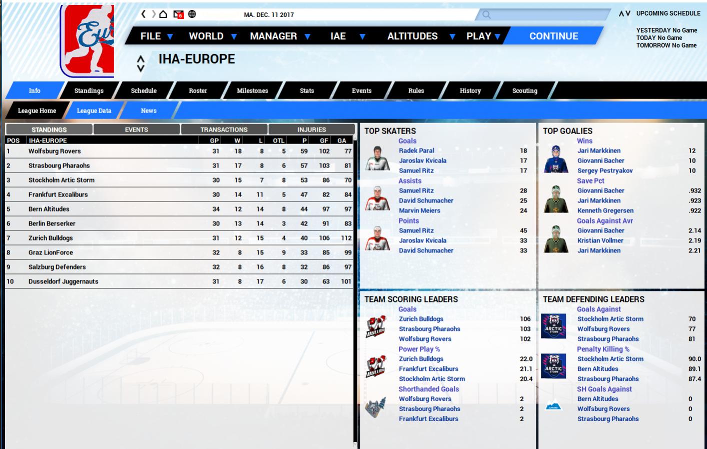 The standings have been quite static as if divided as top 4, next 4 amd bottom 2 .. Let's take a look at the top teams and see what is keeping them atop ... and maybe who has the championship make-up .. READERS: feel free to comment on who you think is tops/most impressive Let's get the first and most obvious away ... Frankfurt Excaliburs... They are ranked right in the middle on almost everything, so they are likely a consistent team, but not really involved in the championship hunt. They lack a playmaker, and it shows, as they have the shooters to score, and score they do on the power play, but it seems they struggle to score outside the power play based on their 9th ranked scoring offense Strasbourg and Wolfsburg actually look a lot alike with really nice balance With the only differences being that wolfsburg is weak on special teams (PP%/PK%) .. ranking in the lower half there Strasbourg is quite solid on special teams, but their achilles heel appears to be, despite a goalie leading the league in save percentage, shots allowed. . Italian Goalie Bacher is standing strong, but good thing! Strasbourg would be lowly on defense if it wasn't for their league leader between the pipes Stockholm is defense! goalie! and special teams! Top three in both special teams percentages and defense.. Outside of special teams, the offense has produced less than championship production, but two of the teams goalies, that is two, is second and third in the league in save percentage... Playoffs come down to goalie play! .. All are rather strong, but Strasbourg and Stockholm seem to be crowns of the bunch