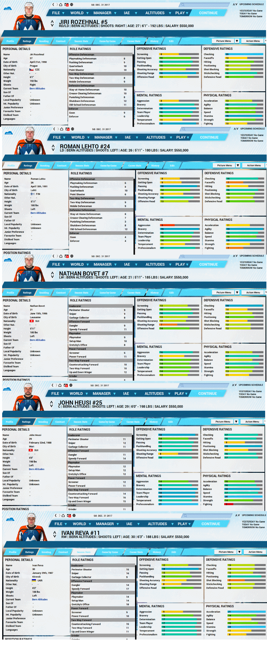 Berlin Berserker Coach: Patrick Lavoie of Canada, offensive Roster: Proficient line-up, skilled wingers and centers and top goalie, strong adequate defenders who are more potential than production Tactics: offensive, non-physical. 1 line: pwr forward, speedy forward, 2way forward, blueline: point shooter/shutdown defender Bern Altitudes Coach: Nicolas Luginbuhl of Switzerland, offensive Roster: John Heusi is a star amongst his peers and the rest of the roster is loaded with offensive players, goalie is a highly skilled player, but also has clear weaknesses at the same time, hit miss with him Tactics: offensive, non-physical high shooting, high tempo with a mix of 2way, grinding and sniping forwards Dusseldorf Juggernauts Coach: Anton Pirhonen of Finland, standard Roster: A roster set-up with nice quality, but perhaps too top heavy especially at the blue liner roster, offset however with quality youth guys Tactics: offensive, non-physical,Shutdown and Rushers and Danglers and garbage collectors laod the first line with a more two way forwards manning the second line Frankfurt Excaliburs Coach: Daniel Stumpf of Germany, offensive Roster: Sound roster, with many shooters, but could use a playmaker to make things open up more Tactics: offensive, balanced, full of perimeter shooters and snipers, 1 line center is a perimeter shooter with the 2nd line being grinder and the 3rd a speedy forward Centers are Graz LionForce Coach: Jiri Beran of Czechia, offensive Roster: A roster with exciting players and style, but not sufficient at the center position Tactics: balanced, non-physical. Quaterback and Point shooter load the 1rst line blue line with a playmaker at center and a perimeter shooter on one wing and a playmaker on the other Salzburg Defenders Coach: Marcus Holweck of Germany by way of NH, USA, standard Roster: Standard roster but lacking on its first line line in the league Tactics: defensive, physical. Speed and aggresive forwards with pushing defenders Strasbourg Pharaohs Coach: Nathan Pichette of Canada, offensive Roster: A mix of overachievers and overrated youth guys, but actually may provide for a well mixed squad and skill overall Tactics: defensive, non-phyiscal. Speed and athletic team with two-way defenders and offensive wingers Stockholm Artic Storm Coach: Eerik Joutsen of Finland, defensive Roster: Swedish base gives the team a nice base of players as well as neighboring country and its Finnish countrymen. Although American defender Bradley Meador and Canadian winger Edwin Galvin lead the squad in talent. Tactics: balanced, non-physical. primarily up and down forwards with shutdown defenders Wolfsburg Rovers Coach: Raphael Bielitz of Germany, standard Roster: Top two lines are interchangeable, and have a very well put-together roster Tactics: Offensive, physical. Full of backchecking forwards and grinders mixed with old school defenders and 2way blue liners Zurich Bulldogs Coach: Yannick Zufferey of Switzerland, offensive Roster: Prominent playmakers, very strong first line, likely proficient in power plays with full strength squad, reliable goalie Tactics: Offensive and physical, Gretzky's officers and mix of old school and 2way defenders.. prominent playmakers allowed in playmaking roles Last edited by NolaSola7; 10-20-2018 at 08:47 AM. |