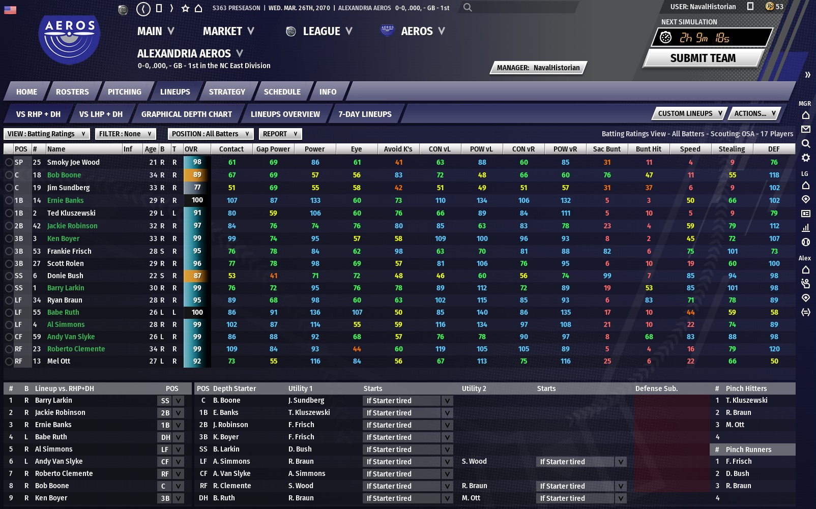 I'm trying to win with pitching and defense this year. Currently I've set my ballpark dimensions to what I think is extreme yet at least somewhat realistic for a real MLB park, (350 LL, LF 374, LC 423, CF 445, RC 423, RF 374 RL 350) with the exception of wall height. I've got a 40 ft. wall all the way around the park. ![]() My ballpark factors are now an average of 1.1. LHB 1.1, RHB 1.1, Doubles 1.5, Triples 1.5. Home runs .900 overall. Any opinions on whether I'm getting myself into trouble the way I've set up my ballpark given this offense and pitching staff? Kevin Brown was supposed to start for me last season but he ended up in the bullpen after several terrible starts and a .300+ BABIP. So I could move him into the rotation. Guidry ended up with a losing record last season but still posted a 3.06 ERA and a .273 BABIP. I'd auction the Babe Ruth card and get a better contact guy at DH but I need it for three collection missions. Last edited by NavalHistorian; 03-08-2021 at 09:08 AM. |