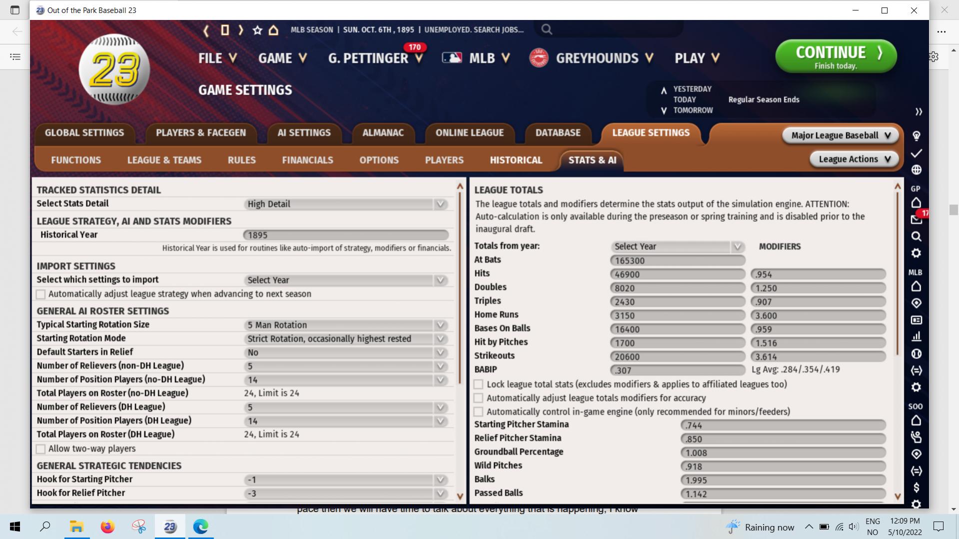 But look at the modifier value. ootp 23 is using a value of 3.000 and is what is generating the 80 home run player Ootp 21 is using 12.000 and is only generating a 50 home run player. Same game, same players, same number of teams, same environment. So that says the way the game is generating stats is WAY different now. And likely players historically are going to see a player or two just go off the charts each season. I also had Amos Rusie in 1890 go 31-2 in a 35 start season. I had never seen that in any of my previous saves. The point is expect big wide swings by players in seasons. Again not saying this is a bad thing, but something we should expect with 23. |