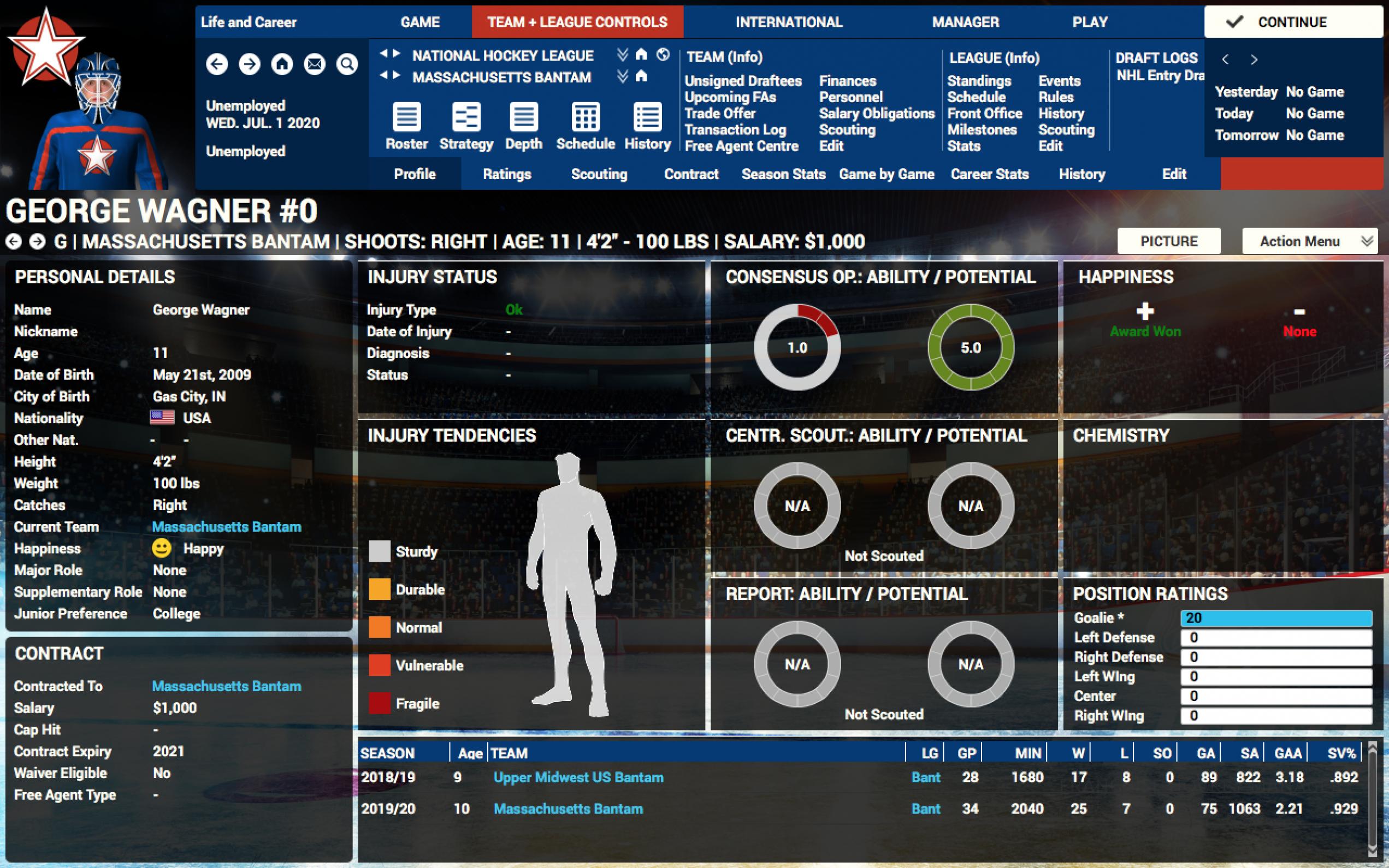 13 year-old right handed centre Vincent Wagner a young man with ungodly ability to read the opponent defense and singling out their weaknesses. He is a modest child who wants to use his hockey skills to help him receive a college scholarship and maybe one day to the NHL but right now he wants to get that degree 10 year-old left handed Left Winger Travis Wagner goes into every shift with the same mindset, score as many goals as he can. He doesn't care for the physical game of hockey he just wants to get to the net and score. He knows he has the skill to make it to the NHL and wants to take the fastest track there 8 year-old goalie George Wagner was forced into the net at a young age by his older brothers. Since then he has made it his life goal to stop not only his brothers from ever scoring but anyone who attempts to take a shot on him. |
