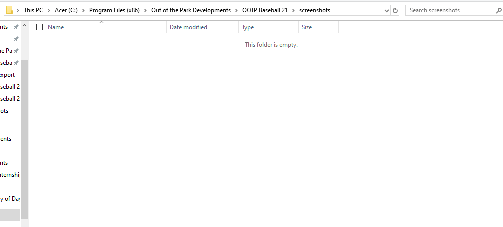 I checked the file explorer, and the folder is nowhere to be found. Hidden folders/file are set to appear, but no luck. I’ve tried re-installing customized game data, creating a “screenshots” folder myself, and a couple other solutions. For what it’s worth, I’ve tried creating a folder through the in-game method, and that folder doesn’t show up in the file explorer either.