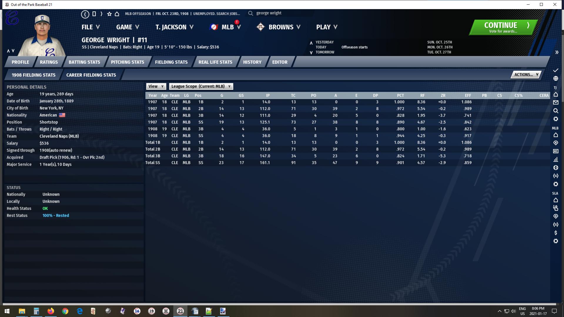 You should get three .txt files in your Documents > Out of the Park Developments > OOTP Baseball 21 > saved_games > Name of Game.lg > import_export folder. One for fielding, one for hitting, and one for pitching. Open the files in a spreadsheet for easier deletion, and delete away those trouble makers from the land of baseball before time. It sounds like there could be quite a few of them for you, as anybody that skipped 1901, but played before that season, and after that season is affected. Once you've tracked them all down, and expunged them from the .txt files (don't forget to do all three), save them. Go back to Game Settings > League Settings > Functions > Import/Export Functions, and hit the Import Player Stats button. Check to see that the problem players are fixed. I had to do this recently with George Wright (the 1871 one). I was using the Spritze Database in order to take his stats back to prior to 1871 for the purposes of my Random Debut game. I like to do this because I don't think it's fair that guys show up past their primes in 1871, and the Spritze Database covers the years prior to 1871 for players. He had one year of fielding, and one year of hitting that were borked in game. Interestingly enough, when I checked the .txt files, one of the 1863 season outputs was in there, and one wasn't. I didn't go back as far as 1863 with him, but the buggers were still in my game. Both were in the game, but only one was in the .txt files. It didn't matter though, as I deleted the one that was there, and re-imported the stats. Both his 1863 hitting and fielding records were removed upon re-import. I guess the game read it on re-import, and treated the file as not there. Weird. Tedious? Yes. But worth it, because those numbers will muck up the stats your players accumulate during your game. Incidentally, I also do this for players who played in foreign leagues before coming to MLB for the same reason. I recently deleted the default Hideki Matsui, and brought him in via Spritze in order to capture his JPCL exploits back in the 1990s and early 2000s. Every player in my game is able to debut a year before they did IRL. I don't know if that's because I use 5-year, double weighted recalc or not, but that seems to be the standard, so I wanted to give him the same benefit. IRL, he debuted at age 19 with the Yomiuri Giants, so I wanted to get him in for his age 18 season. The game has marked it as his age 17 season, but that's false as you can see in the image below. The cutoff date for determining how old the player is for any season is July 1st. His birthday's on June 12th, and in my RD game his birth year is 1888, so he should've been 18 in his debut season of 1906, but the game listed him as 17. Looks like "Godzilla" is gonna be an absolute beast in the coming years. A 4.4 WAR season at age 20? Yowza! |