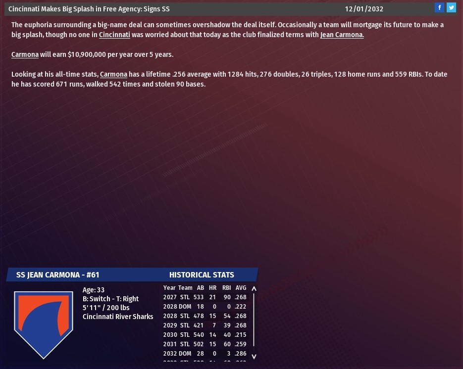 Carmona, 33, had been the starting shortstop for the St. Louis River Walkers since the 2022 season and earned six Gold Gloves during that span, including the 2031 season. It wasn't the dollars which scared off St. Louis, as Carmona refused an offer worth much more than that from the Walkers, but the number of seasons. With the five year contract, Carmona will be part of the Sharks roster through at least his 36-year-old season and possibly his 37-year-old campaign, if he reaches his vesting options in 2036. Last edited by rink23; 04-18-2021 at 05:07 AM. |