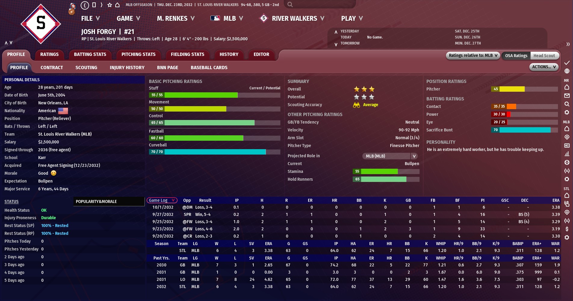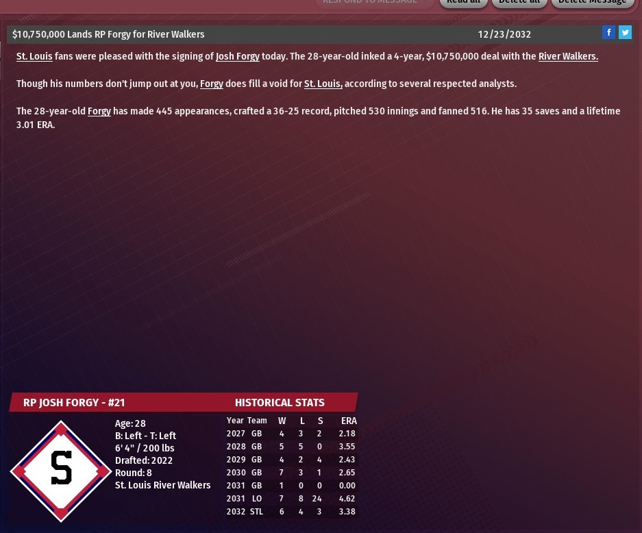Meier, 28, primary numbers in 2032 were not impressive -- he was 6-16 with a 3.03 ERA in 32 starts -- but what jumps out is his 1.07 WHIP and 4.9 WAR. Meier was spent his four seasons in the majors -- all with the Mad Men --moving back and forth between the rotation and the bullpen. Overall, he owns a 25-39 record in 154 games (83 starts) with a 3.56 ERA and three saves. Thompson, 23, has been a top prospect for the Walkers for a few seasons but has had his path to the majors blocked by Jose Segura to be the team's primary center field. In 2032, Thompson played in 31 games for the Walkers hitting .236 with four homer and 11 RBIs. Overall, Thompson has played in 82 games in the majors over two seasons and hit .218 with 14 homers and 41 RBIs. Haas, 26, is another top prospect who has struggled in his opportunities to succeed at the major-league level. In 2032, he started 13 games for St. Louis going 2-6 with a 6.66 ERA. Overall, Haas has started 18 games for the Walkers going 3-7 with a 6.35 ERA. A veteran right-handed reliever, Grissom, 32, spent just the 2032 season in St. Louis during which he got into 72 games and went 3-7 with one saves and 3.79 ERA. Grissom has been in the majors since 2026 -- he spent six seasons in Columbus before joining the Walkers -- and has pitched in 371 games. He owns a record of 25-23 with three saves and a 3.96 ERA. |