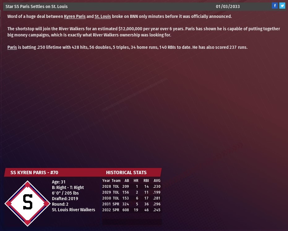 The deal is worth $12 million per campaign, with the final season featuring a team option. The 31-year-old Paris spent last season in Springfield, where he enjoyed his best season at the plate batting .245 with 19 homers and 46 RBIs in 152 games. For his career, Paris is a .250 hitter with 34 homers and 140 RBIs over eight seasons -- six in Toledo and two in Springfield. The 2032 season was the first where Paris had started more than 75 games. He replaces Jean Carmona, who signed with Cincinnati after spending 10 seasons at the starting shortstop of the River Walkers. Last edited by rink23; 04-18-2021 at 06:34 AM. |