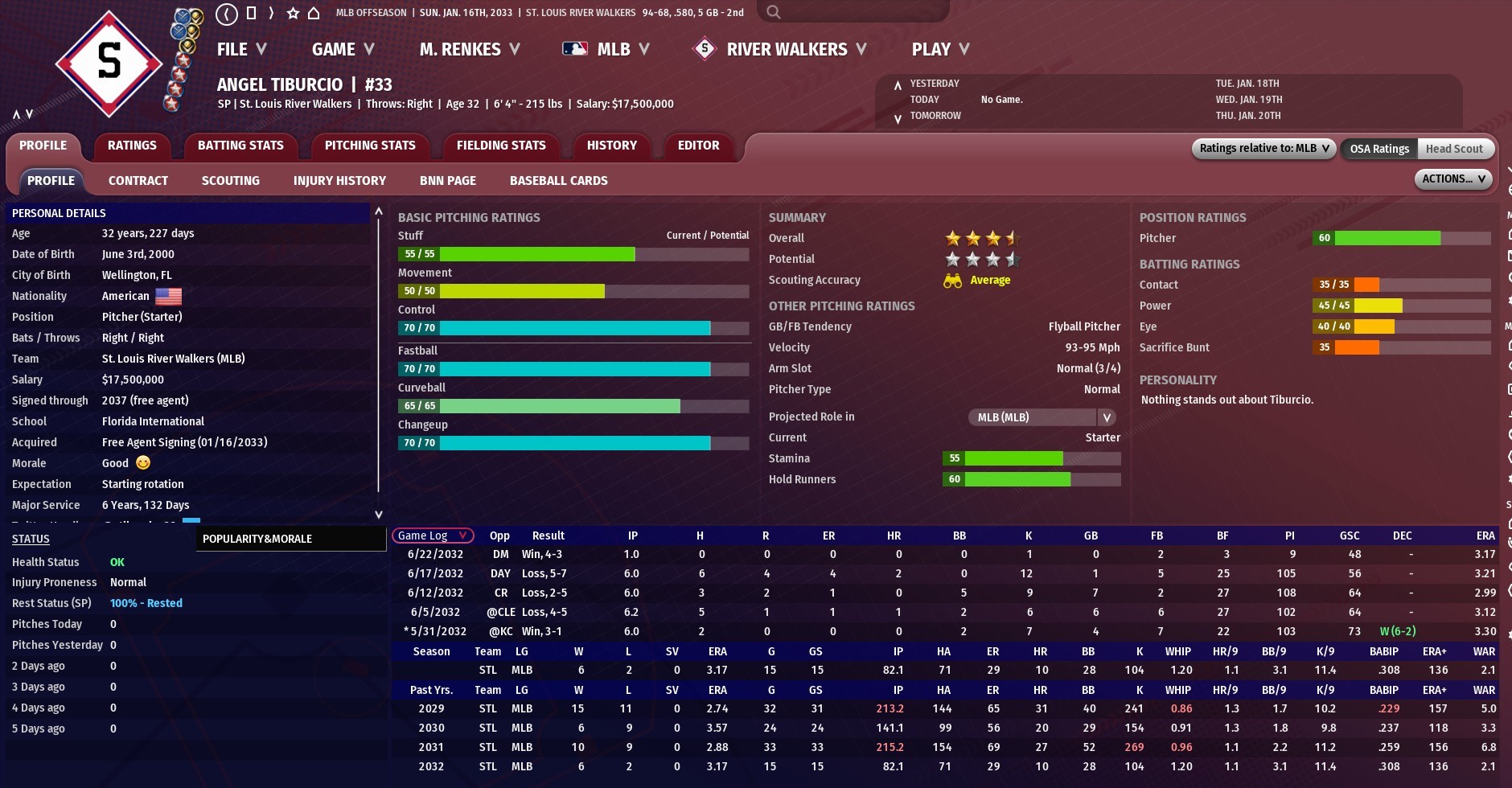 Tiburicio, 32, has been with the Walkers since prior to the 2026 season when he was acquired in a trade with Twin Cites. After a season in the bullpen, he went on to become one of the top pitchers in the MBL winning Cy Young awards in 2028, 2029 and 2031. He also had seasons which were cut short by injuries in 2030 and 2032. The 2032 campaign saw Tiburcio go 6-2 in 15 starts with a 3.17 ERA before surgery to remove bone chips from his right pitching elbow sidelined him for the season. In his seven seasons in St. Louis, Tiburcio has gone 70-51 with a 3.22 ERA in 213 game (166 starts). |