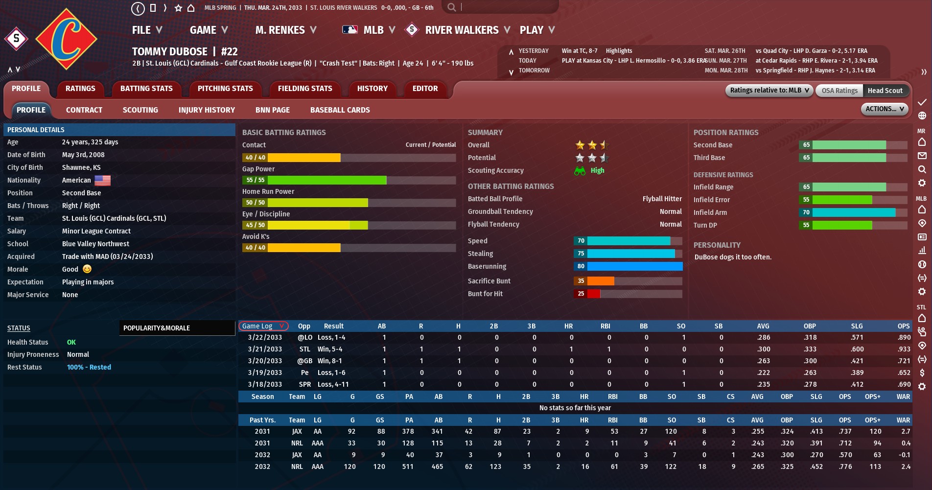 A ninth-round selection in the 2026 draft, DuBose is considered a top defender who should be able to hold his own at the plate. He enjoyed his best season in 2032 at AAA Northern Louisiana, where he hit .265 with 16 homers and 61 RBIs in 120 games. For his career, DuBose is a .254 hitter with 64 homers and 299 RBIs in 614 games. DuBose will likely get a look in the few remaining spring training games, but will probably start the season at AAA Memphis. In Gordon, the Walkers surrendered who was their third pick in the 2027 draft. In 2032, Gordon hit .287 with 24 homers and 77 RBIs at AA Springfield. For his career, he is a .320 hitter with 24 homers and 77 RBIs in 102 games. The one knock on Gordon is he is considered a well-below average defender. McCaskey was taken in the 22nd round of the 2025 draft. He spent the 2032 season at Memphis, his second season with the Redbirds, where he hit .324 with six homers and 10 RBIs in 32 games. In his career, McCaskey has hit .286 with 15 homers and 227 RBIs in 581 games. While he hits for average, McCaskey's chances to make the majors seem limited as to he only plays shortstop where the Walkers have made a long-term commitment to Kyren Paris. |