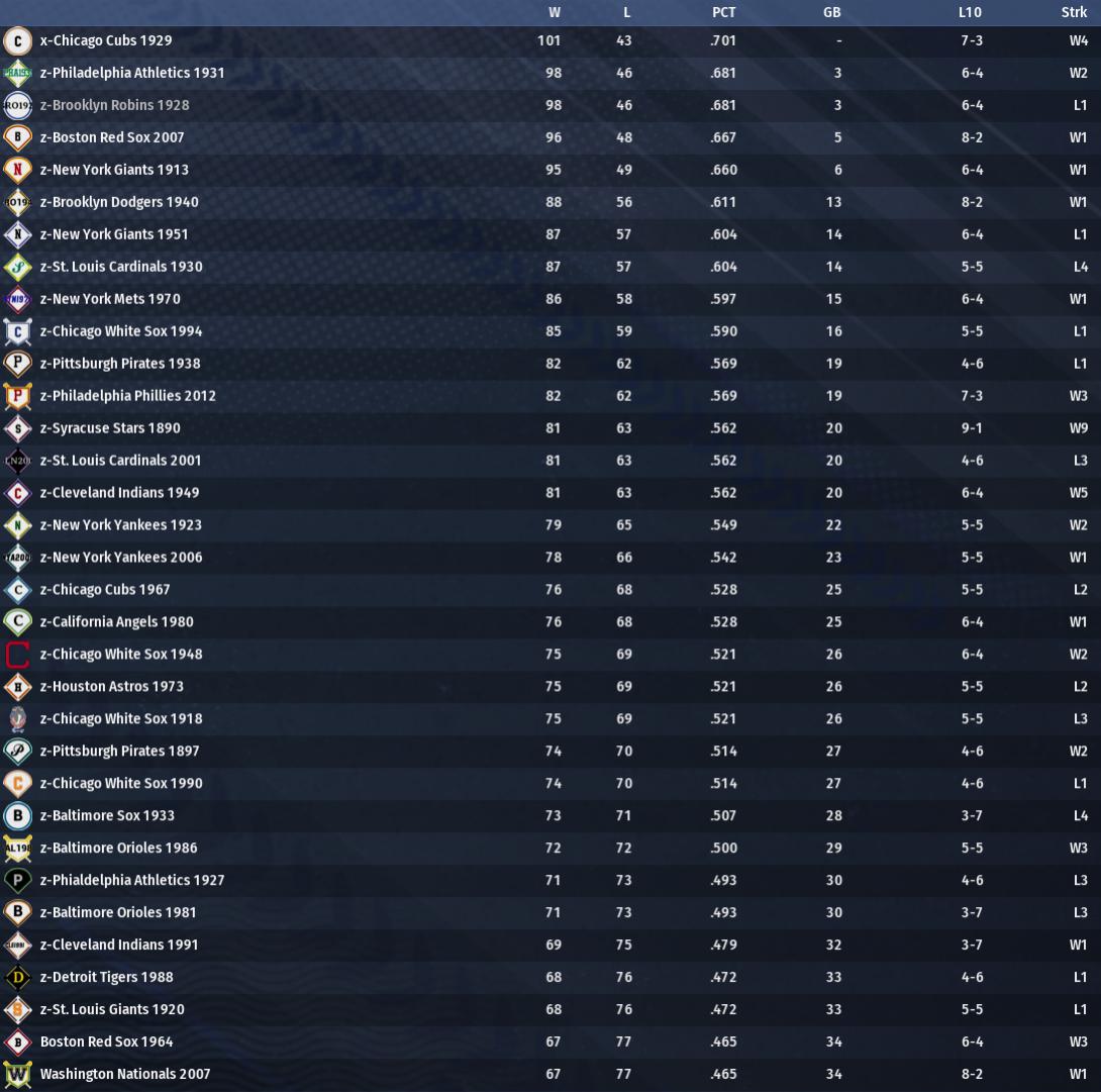 Settings year: 1949 Highlights: The 2nd seeding round league came down to a game 7 between the 1927 St. Louis Cardinals and the 1971 Baltimore Orioles. In the end, the 1927 St. Louis Cardinals scored a 7-2 victory to earn a spot in the top 300. This league also features our first case of being a home-year team. This is the term I am using to describe a possible advantage teams have by playing with the same settings as they played in. The 1949 St. Louis Cardinals took advantage of the situation and earned a bye to Round 2. The National Association winning 1875 Boston Red Stockings finished second to last in the league 34-110, underscoring the difficulty the National Association will face to qualify a team out of the seeding round. We did see our first Negro League team to qualify. The 1924 Chicago American Giants have a bye until the 2nd round after an impressive 85-59 season. The 1912 Washington Senators will have a rather dubious distinction. Despite Walter Johnson winning the Cy Young unanimously, they werent able to advance out of the round. The 1998 Chicago Cubs won the last-chance playoffs over the 1933 Boston Red Sox in 7 games so we will keep an eye on them in Round 1. MVP: 1. Cristobal Torriente (1924 Chicago American Giants) - .402/19/137/11.9 676 (47) 2. Mike Schmidt (1980 Philadelphia Phillies) .331/32/112/10.7 407 3. Walter Johnson (1912 Washington Senators) - 377 (2) See Cy Young for stats plus 2.1 batting WAR Cy Young: 1. Walter Johnson (1912 Washington Senators) 22-9/2.14/156/10.5 343 (49) 2. Phil Douglas (1915 Cincinnati Reds) 23-10/2.37/131/7.8 192 3. Roy Oswalt (2005 Houston Astros) - 19-10/2.13/133/7.9 136 Last edited by msc123123; 05-22-2022 at 11:56 PM. |