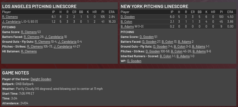 GNB Ballpark LOSA: Roger Clemens (0-0, 0.00) NYOR: Dwight Gooden (0-0, 0.00) Well the first of our GotW features was a total no-brainer, with Rocket Clemens and the Canaries heading to GNB Ballpark to take on Doc Gooden and the Gothams. It’s the ’86 World Series all over again! As you can see from the lineups screenshot below, the Gothams have a fairly clear edge here, especially given they are at home. Still, they shouldn’t expect to get it all their own way, with plenty of pop in the LA bats and Rocket obviously ready to go. McGraw and Lasorda will have their charges primed to get the season off on the right foot, so this should be a beauty. TOP 1ST A nervy start for Gooden, who walks Bonds to lead it off and then surrenders an RBI triple to Lindor. A base on balls to Slaughter puts men at the points, and a Griffey jr groundout brings Lindor in from third. Gooden issues his third walk of the inning but manages to get out of the inning without conceding further. LOSA 2, NYOR 0 BOTTOM 1ST No such problems for Clemens, who starts confidently with a 1-2-3 inning. TOP 2ND Gooden regathers himself and sends them down in order. BOTTOM 2ND Clemens retires the first two men he faces no problem, but then gives up back-to-back singles to Judge and Campanella. He gets out of the inning unscathed, however, when he gets Jones to ground out harmlessly. TOP 3RD An infield hit with two out puts Griffey jr on base, and he steals second to move into scoring position, but is stranded there when Molina whiffs. BOTTOM 3RD Another incident-free inning for Clemens. TOP 4TH Gooden, in the groove now, retires them in order. BOTTOM 4TH Medwick leads off the inning with a single to right and moves to second on a Mathews groundout. Bagwell reaches on a HBP, putting the tying run on. After Judge strikes out, Campanella singles to get the Gothams their first run. Jones then grounds out to 2B to end the inning. LOSA 2, NYOR 1 TOP 5TH A one-out single puts Bonds on base and a wild pitch allows him to advance to second. He’s erased, though, on an iffy call to steal third. That hurts more when, after Lindor walks, Slaughter singles. Gooden again escapes falling further behind by getting Griffey to ground out to SS and end the inning. BOTTOM 5TH Two-out trouble for Clemens when Winfield singles and gets to third on a Medwick double. He escapes as Mathews flies out to deep RF to end the inning. TOP 6TH Just a hit and stolen base to Rogan, who is left at second when Williams strikes out looking. BOTTOM 6TH Judge walks with one out and moves to second on a Campanella single, but Clemens fans Jones and gets Grich to ground out to 3B to end the threat. TOP 7TH Gooden’s control issues continue as he walks Randolph to lead off the inning and McGraw decides he’s seen enough, summoning Colon from the bullpen. Bartolo strikes out Bonds but then puts Lindor aboard with a walk and gives up a 2-run double to Slaughter. They give Griffey jr a free pass to set up the DP, but Colon instead fans Molina and gets Rogan to ground out, ending the inning. LOSA 4, NYOR 1 BOTTOM 7TH Things are looking grim for the hosts, but Alomar revives the home fans’ hopes with a leadoff double, steals third and scores on a Winfield groundout. That ends Clemens’ game, with Lasorda bringing in Candelaria. He retires Medwick for the second out but then gives up a solo homer to the lefty Mathews and New York are right back in it. The inning is over when Bagwell flies out to RF. LOSA 4, NYOR 3 TOP 8TH Colon walks Schmidt to lead off the inning and Williams bunts him over to second. Randolph then singles to put men at the corners but Bonds can only move the runner to second when he grounds out sharply to 3B. Colon then strikes out Lindor to strand the runner. BOTTOM 8TH The raucous GNB crowd goes crazy when Judge leads off the inning with a solo shot to knot the game at 4. LOSA 4, NYOR 4 TOP 9TH Griffey jr gets aboard with a one-out bloop hit but Adams, in for Colon, retires the next two men to douse the threat. BOTTOM 9TH The crowd smells blood as Alomar leads off with a single and goes to second on a Winfield single. And the comeback is complete when Medwick caps off a great game with a walkoff double. NYOR 5, LOSA 4 FINAL WP: Babe Adams (1-0) LP: John Candelaria (0-1) POTG: Dwight Gooden Well that certainly lived up to the hype. Despite his wildness, Gooden hung tough and the Gothams never stopped trying. Clemens was great but the question has to be asked why Lasorda stuck with Candelaria for so long. Then again, it’s easy to wonder these things after the event and the Canaries’ offence had their chances to put the game away. A fantastic start to the league indeed.