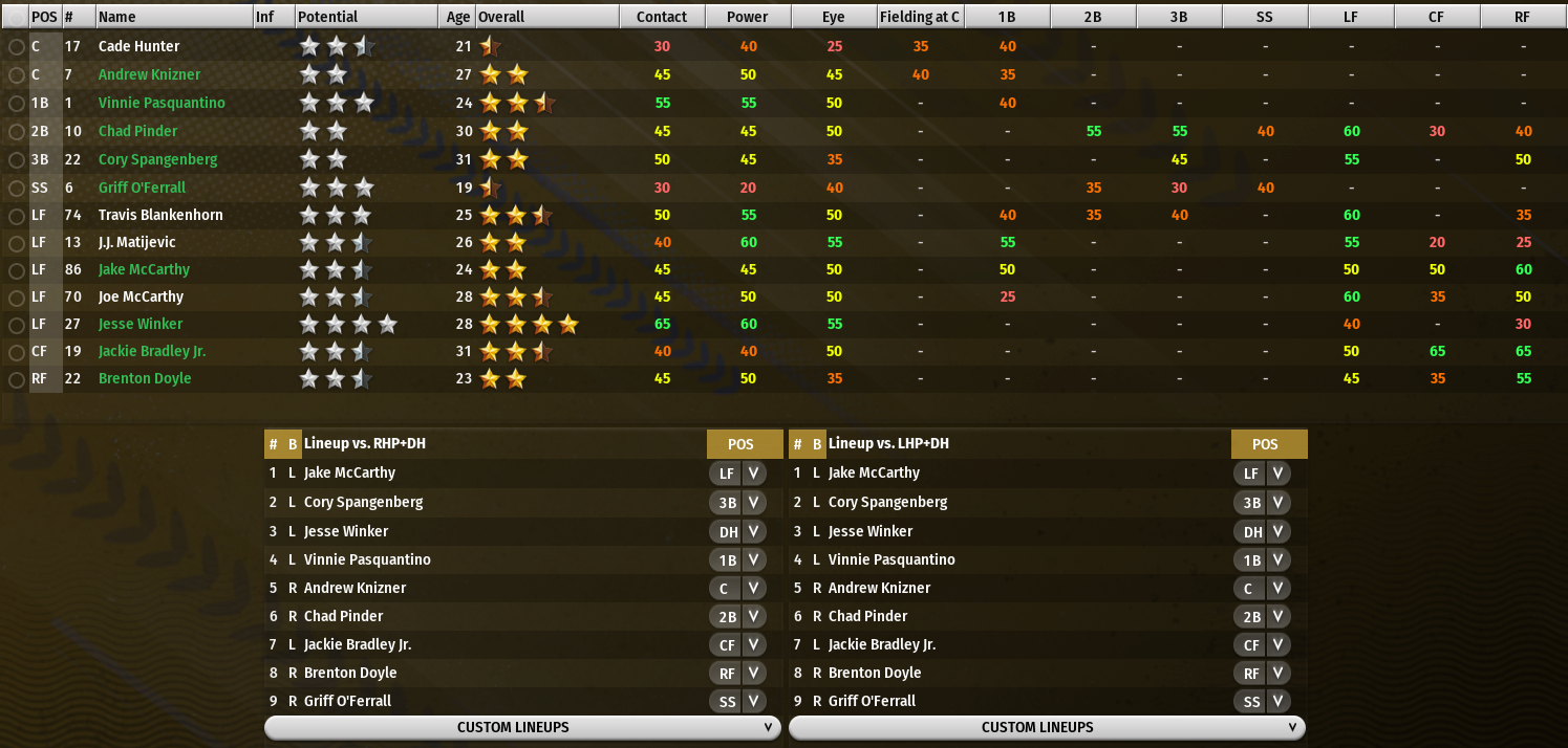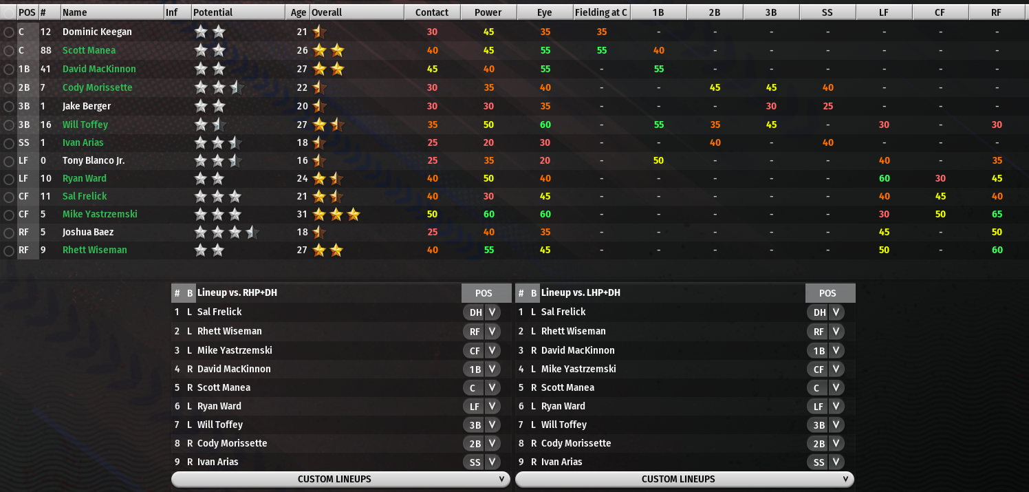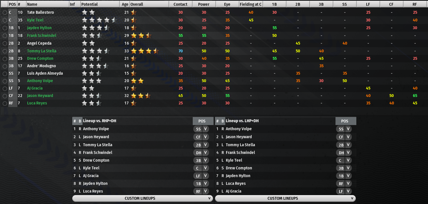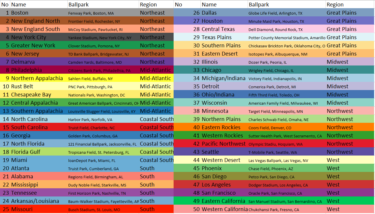 I've been lurking in the shadows in this forum for quite a while. I mostly enjoy wacky simulations with real players, which I spend most of my time on while playing OOTP. There's one simulation idea that had always been in my head but I've never had the guts to start off with. That's got to change. This is the time to document that labor of love I've been wanting to give a shot: What would a big tournament between all different states look like? We don't have anything like this in real life. College baseball probably comes closest with hometown heroes playing with the name of the state on their chest. But there's no limit on recruitment of players from another state. No, what I want to know is what a tournament of every single state would look like. 50 states, 1 winner. What state would win? This was the premise of my idea, but it immediately had two issues: the size of certain states as compared to others doesn't really make this tournament that exiting from the onset. I think it's pretty safe to say either California, Texas or Florida would win this tournament. Also, some smaller states do not have enough players in the game's database to form a 26 man roster. That's why I came up with the idea to - instead of using 50 states - divide the US into 50 regions of equal population size. This way every region has the same amount of players to choose from which made it possible to actually create 50 different rosters. It also ensures some excitement because now we'd have different teams from California, Texas and Florida. Luckily I didn't have to start from scratch with this idea, because a quick google search later I found out that a redditor had already came up with a very useful map. I'd love to credit him/her but unfortunately I can't find the post anymore. Anyway, here it is: ![]() ![]() Let me start off saying I'm not from the United States. You might have noticed English is not my first language as I'm from the Netherlands. I have no rooting interest in any region whatsoever. I also do realize that some regions are very weirdly chopped. The Midwest looks like it has all the new borders just a few 100 miles too much to the right. And Orange County suddenly belongs to San Diego. The region names are probably terrible too. And I bet there's more in here that might not really appease everyone. But yeah, we have to draw a line somewhere. Get it? Draw a line? I'm sorry. Anyway, this way every region more or less has 6.5 million inhabitants. The Rosters So how did I come up with all rosters? Basically I've exported a list of every American born player in OOTP filtered by place of birth (according to OOTP). I then distributed them according to this map. To make the best rosters without spending too much time I've used players CAs and PAs to quickly rate them (with CA counting for 60% and PA for 40%). This helped me pick every region's best 2 catchers, 6 infielders, 5 outfielders and 13 pitchers for a total 26 man roster. If there were any ties, I used various tiebreakers like major league or professional experience, age, stamina. Some regions were quite thin on professoinal experience so there are quite a few High School/JuCo/NCAA with 4* or 5* PA in there as well. In my next posts I'll publish all 26 man rosters of the 50 different regions. The Tournament Structure I love simulating and watching games myself so having a 162 game schedule was never going to happen. I've derived inspiration from the College World Series. However, because I feel like one bad day often leads to the favorites crashing out way too early, I've come up with some alterations. Basically this tournament will consist of five phases: Regionals - Every team is distributed over one of 8 regions. You can see these in the image I uploaded above. Every region contains 6 or 7 teams. Every team will compete in their regional first. These tournaments will be a triple elimination knockout. I liked the knockout idea, but single elimination was out of the question. Even double elimination felt too cutthroat for me, so I've gone with triple elimination. This will guarantee every team to at least use every starter once. You will learn more on what the schedules look like when this phase starts. - The best 4 teams of every regional will advance to the Super Regionals. That's right, only the 5th, 6th and 7th team of every Regional will be eliminated. - Games will be played at the ballpark of the home side. - The final position in your Regional will be very useful as this determines your seeding for the Super Regionals. Super Regionals - After the Regional phase, all 32 remaining teams will be divided over one of 8 Super Regionals. A draw will determine which team will play where. - Every Super Regional contains one #1 from the Regional phase, one #2, one #3 and one #4. - No two teams from the same Regional will be drawn together in the same Super Regional - All games will be played at the stadium of the #1 seed (more or less like in college baseball). - The format will again be triple elimination, but a 4 team triple elimination this time. - This time only the 8 Super Regional winners will advance to the next phase. Elite Eight Series - The 8 Super Regional winners will be drawn into four different Elite Eight Series. - These will function more or less like the LDS in MLB, with all series being Best-of-5. - Ties will be determined based on seeding. All teams win record in the two prior phases will be used to make a list from #1 to #8. In case of a tie, net run rate will be used. More on that later when the phase arrives, but it's a concept from cricket. You can learn about it here. - The 4 winners will advance to the Final Four Series Final Four Series - The 4 winners advance and will be paired based on seeding again. - The Final Four Series are best-of-7. - The 2 series winners will advance to the Series of the States Series of the States - The 2 winners of the Semi Final Series will play the Series of the States in another best-of-7 