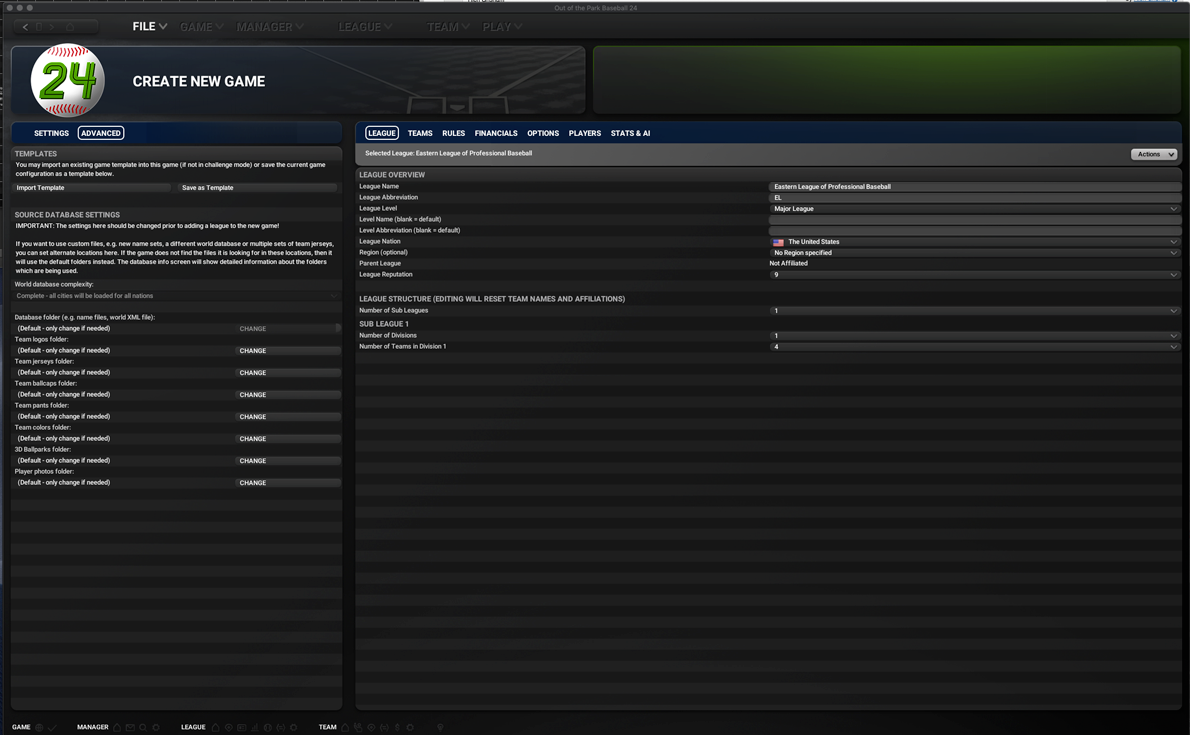 1) Don't want to have to delete a bunch of players with 1888 PCM modifiers 2) I wanted to load a template I already had with my settings for this first league in my fictional universe Still doesn't explain why this Advanced League Creation isn't working. |