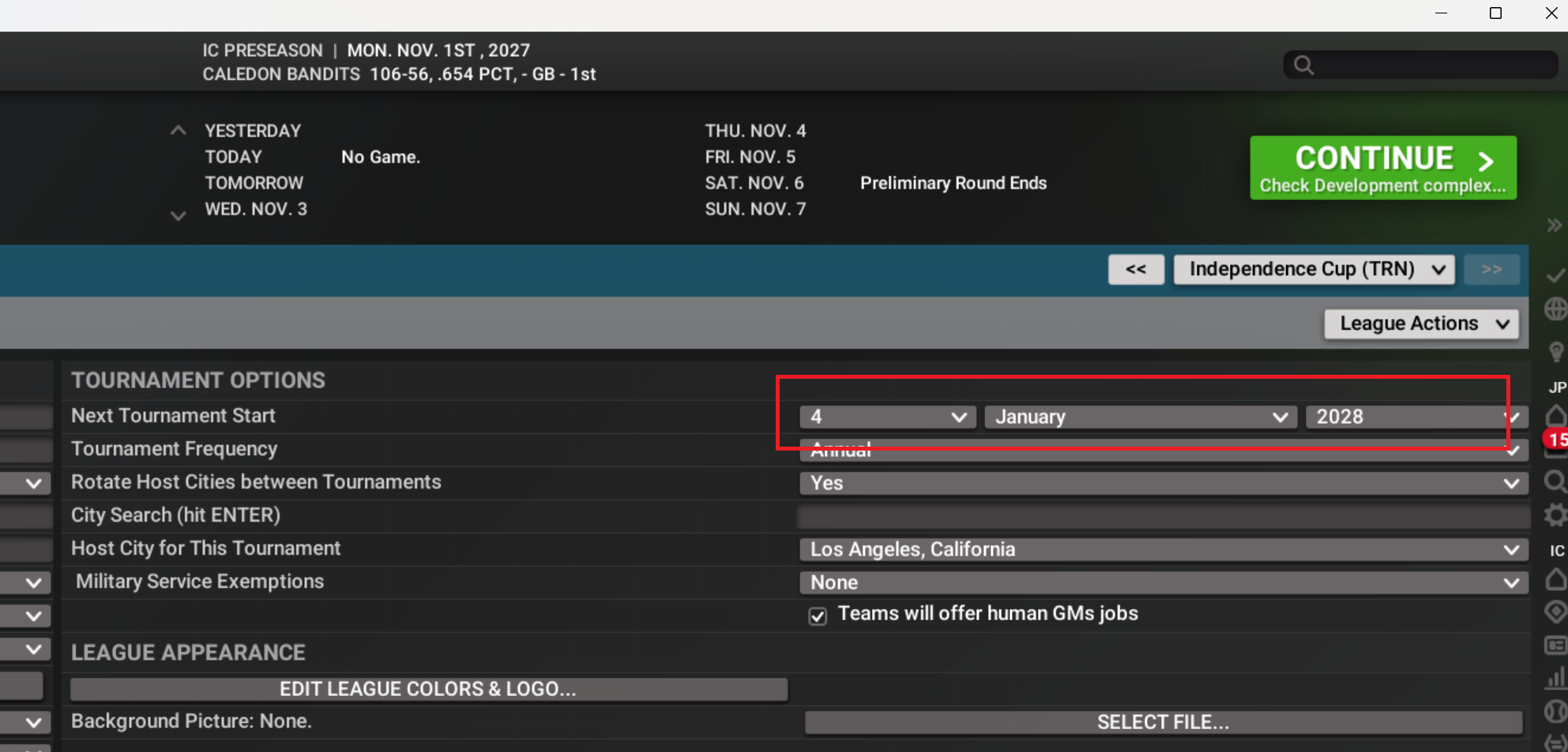 Custom tournament set. Teams added from custom independent leagues. Date set. League is currently in 2027. Next tourney scheduled for Jan 2028.