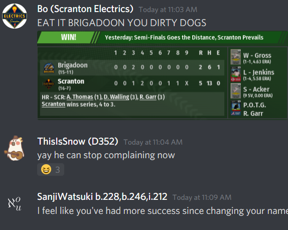 it's been that kind of season.... my hitless wonders are "leading" all 30 teams for the worst team average (.235 right now).... to be fair, my park dimensions were tweaked in the off season to hamper offensive production, so that's a big part of it... we'll be moving the bar back towards some offense for next season to keep searching for that sweet spot.... |