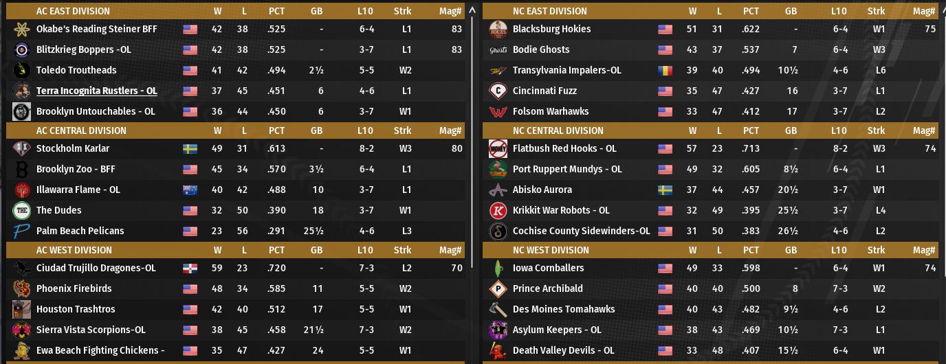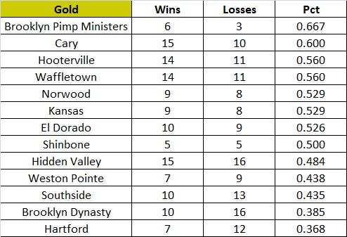 Pimp Ministers take the OL lead making the most of their limited early schedule. As already noted, the AC West is looking like all five teams are backing away from the lead leaving it wide open to anyone. Almost an exact copy in the NC East where Weston Pointe took some initiative and broke the .500 mark. |