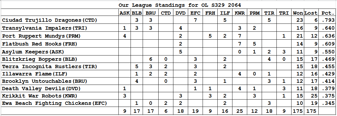 Diamond - Kansas, Cary, and Hidden Valley to gold. Gold - Highland to diamond; Flatbush, Port Ruppert, Ciudad Trujillo, Brooklyn Untouchables, Krikkit, Illawarra all to silver. Silver - Hartford, El Dorado, Hooterville, Norwood Red Menace, South Side all to gold; K-Town, Vlora, and Shangri-La to bronze. Bronze - Death Valley to silver; no relegation. Iron - Ring Road to bronze; no relegation. Stone - Chicago and Iron Maiden to iron. |