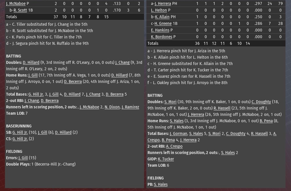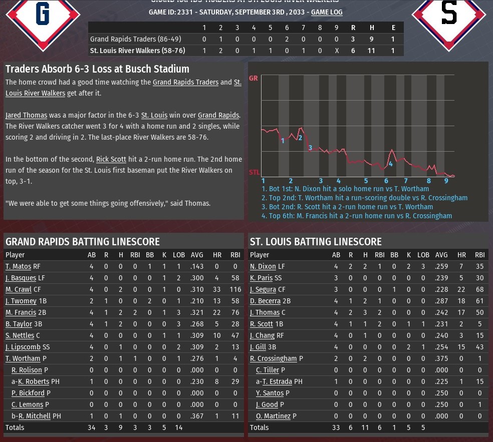 St. Louis jumped on Grand Rapids starting pitcher Adam George for five runs in the bottom of the first inning, and rolled to a 7-2 win at Busch Stadium (2006). The win gave the River Walkers in three of the four games in their series with the Traders. Down 1-0 after a half inning, St. Louis wasted no time wiping out that deficit in the bottom of the first. Kyren Paris got things going with a lead-off single. After a strike out of Jose Segura, Paris stole second, and scored when Jose Ramirez singled. The rest came via the long ball, as Dan Hillard hit a three-run homer. Rick Scott followed with a solo shot, making it 5-1. Hillard picked up two more RBI in the fifth, when he doubled off Kevin Abel. That made it 7-2. The Walkers got a complete game from rookie Alex Pazos (2-4). Over the nine innings, he allowed two runs on three hits. He struck out four and walked five. Last edited by rink23; 06-10-2021 at 05:46 AM. |