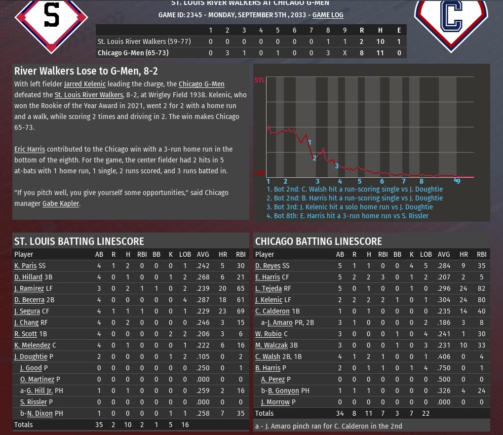 Daylen Reyes connected on a two-out, two-run single off St. Louis reliever John Good in the bottom of the eighth inning to help lift Chicago a 5-4 win at Wrigley Field (1938). The win gave the G-Men a sweep of the three-game series. George Phelps and Brian Gonyon got things going for the G-Men in the bottom of the eighth when they opened the inning with a walk and single, respectively. Good retired the next two hitters, although the base runners did move to second and third. Reyes then lined a 3-2 pitch from Good into left field to plate them both and put his team in front. A three-run top of the third for St. Louis against G-Men starting pitcher Jon Borland put the River Walkers up 3-1. Jose Ramirez led off the sixth with a homer, as St. Louis took a 4-2 advantage. Borland pitched six innings, allowing four runs on seven hits. He struck out seven and did not issue a walk. Michael Steinberg (4-2) worked two innings of scoreless relief and earned the win. Jeremy Bouchard earned his 22nd save with a scoreless ninth. Last edited by rink23; 06-11-2021 at 04:43 AM. |