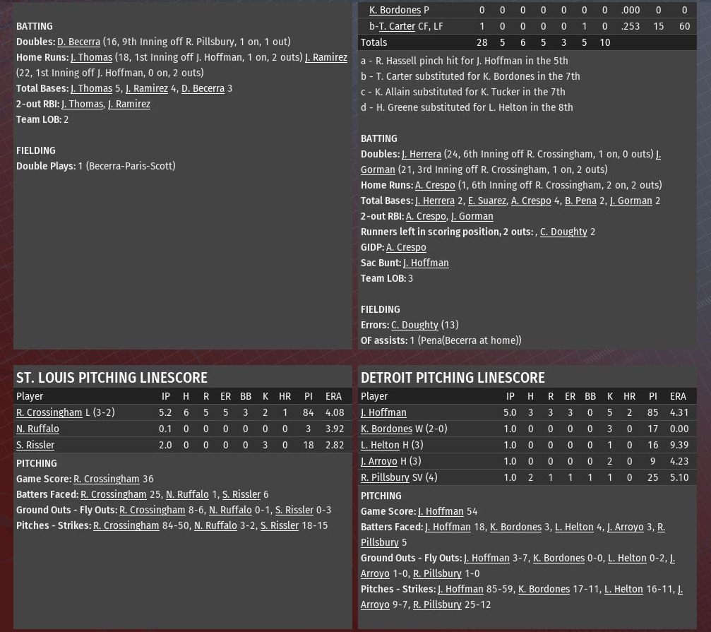 Trailing 3-2. Detroit's Alejandro Crespo hit his first career major league home run, a three-run shot off St. Louis starting pitcher Ronald Crossingham to help give the Diesels a 5-4 win at Tiger Stadium (1980). Crossingham got into trouble early in the inning, issuing a lead-off walk to Jimmy Gorman followed by a Juan Herrera double. Cade Doughty made it 5-2 when he scored Gorman with a ground out. Bill Pena followed with a single to put runners at the corners. Crossingham struck out Lee Oakley for the second out. However, Crespo got ahold of a 3-2 pitch and hit it 401 feet over the wall in right to put Detroit in front. With runners at second and third and one out in the top of the ninth, the River Walkers pulled to within a run in the top of the ninth on an RBI single from Jared Thomas off Diesels reliever Rob Pillsbury. But Daniel Becerra was thrown out at the plate. Pillsbury struck out Dan Hillard to end it. Detroit starting pitcher Jeff Hoffman allowed three runs on three hits in five innings. He struck out five and didn't walk a batter. After that, it was a scoreless inning each from Kleiber Bordones, Luis G. Helton, Juan Arroyo and Pillsbury. Bordones (2-0) earned the win. Pillsbury collected his fourth save. |