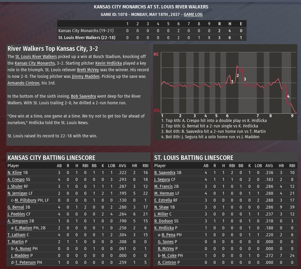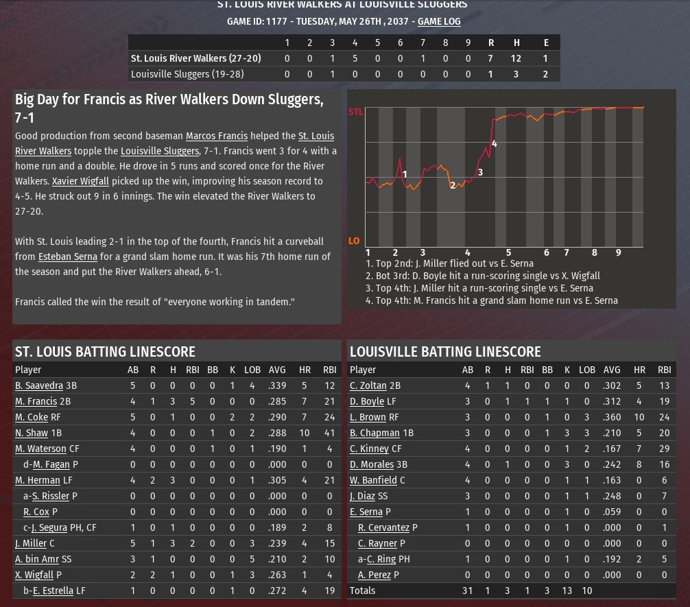 Hector Tavares homered twice, and Ann Arbor went deep three times in the first four innings to pave the way for a 6-2 win over St. Louis at Busch Stadium (2006). A former top prospect for the River Walkers, St. Louis traded Taveras to the Wolfpack during the 2036 season, in 2037 he has busted out. The 27-year-old hit a solo shots in the second and third innings off River Walkers starting pitcher Ming Xiang. For the season, Tavarez is hitting .331 with 23 homers and 50 RBIs with just 42 games gone in the season. His first homer put Ann Arbor ahead 1-0. The second was part of a three-run inning, which saw the Wolfpack go up 5-0. Shaun Young hit a two-run homer just before Tavarez second solo blast. Bill Pena, who St. Louis traded to Ann Arbor just last week, also had an RBI single in the inning. The Wolfpack extended their lead to 6-0 in the fourth. Pena drove in the run, connecting on a two-out single off Xiang to score Glenn Santiago. A two-run homer from Eddie Estrella in the bottom of the fourth off Ann Arbor starter Joe Alvarado accounted for the only runs for St. Louis. Alvarado (2-2) worked five innings, allowing two runs on six hits. He struck out eight and didn't issue a walk. Five relievers, four of them pitching a full inning, completed the game for Ann Arbor. Ryan Lodge (1.0 IP), was the first of them. He was followed by Scott Von Lehmden (1.0), Kyle Gatti (1.0), Duarte Picado (0.0) and Joey Thacker (1.0). Thacker, who started his career with St. Louis, earned his 14th save. |