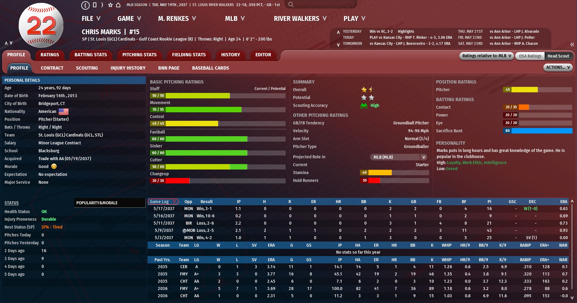 The trade of Bill Pena to Ann Arbor opened the door for Waterson's promotion. It is believed Waterson may get a shot to earn the starting center field job from the struggling Jose Segura. In 36 games this season at AAA, Waterson has hit .272 with six homers and 23 RBIs. Waterson has played in the majors before getting brief callup in 2035 and 2036. In 51 games with the Walkers, Waterson has hit .183 with five homers and 11 RBIs. |