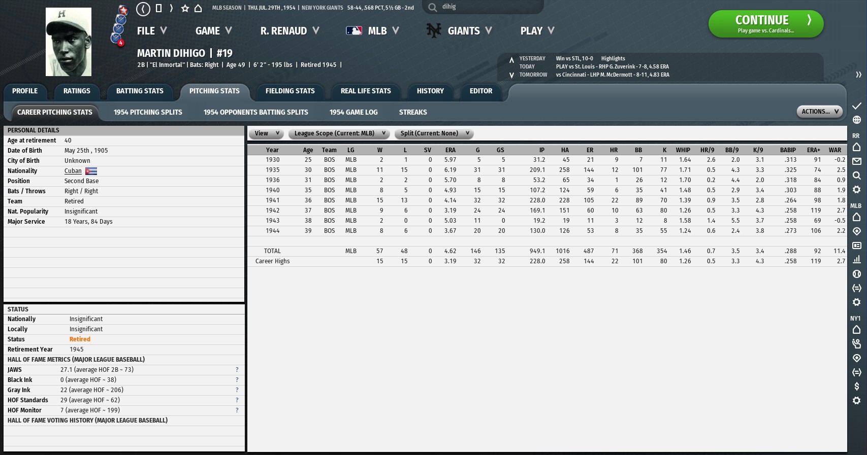 Here he doesn't get to play much in the early part of his career, then misses a bunch of seasons because I had "Missed Season IRL" check box on. So he had a very average career as a batter. As a pitcher he had two double-digit win season, but a life ERA+ below 100. Very mediocre for someone who Mel Ott (or someone else?) called the "best player he ever played against". |
