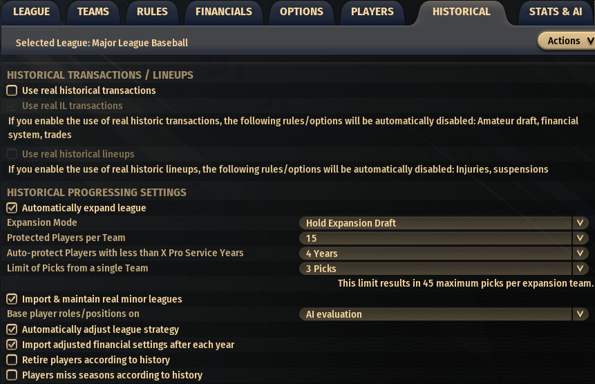 I have one league that I started in 2008 with the Nationals. The draft in this league is working as I like. Players are available in the draft the off-season before they made their Minor League debut. So the first draft in this league was December 2008, and it included Trout, Arenado, J.D. Martinez, Shelby Miller, Mike Minor, all guys who were drafted and made their MILB debuts in 2009. Strasburg, who was drafted in 2009 but made his MILB debut in 2010, was available in the next draft, after the 2009 season. Same story for Harper, he was available the draft after the 2010 season. These drafts are populated with thousands of prospects. Prospects who made their MILB debuts in 2008 or earlier, such as Freddie Freeman and Buster Posey, were already in the game and on their correct teams when I created the league. Now, I want to make a new league starting in 2018. I checked the Import Negro Leagues and Minor leagues option, as well as automatically import historical rookies. But these drafts are not being populated the way they are in my other historical league. The 2018 draft has a total of 26 players. The top players in the draft are Bo Bichette and Cavan Biggio, guys drafted IRL in 2016 who should already be in the Blue Jays minors when I start the league if it was working like my other league did. Even more confusing, guys drafted in 2016 or even 2017 and 2018 IRL do already exist on the correct teams; guys like Casey Mize, Royce Lewis, Kyle Wright, Pete Alonso, and Bryan Reynolds . I'm really not sure why it's treating some guys, like Bichette and Biggio, differently than the others. What gives? What settings do I need to have checked on league creation to make sure it works like it did for my 2008 league? I thought I checked the same options, and have tried multiple times with different options checked to set up the 2018 one correctly, but no luck thus far. |
