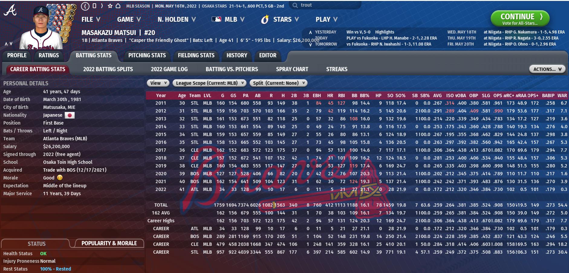 Osaka is definitely in trouble, 4.5M in the red for budget, havent had a 500 season since 2013. Took me a while but I found the current best player in JPBO. Over 10 WAR last season. Hisanori Oba, with insane contact and power ability. Plus Plus defense at 2B. I also added two independent leagues for Japan, I feel it serves as a good development ground for prospects that aren't drafted. Last edited by uknownick; 02-03-2023 at 06:00 PM. |