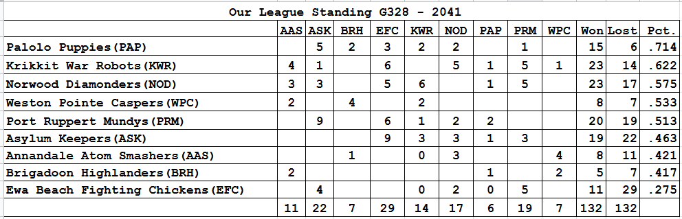 Palolo, with eight games left to play, need only go .500 to clinch the crown. Four of the games are on the road at Norwood. While the Diamonders have the steepest hill to climb, they also have a dozen games left, enough to make a miracle run possible, with the help of a slump by Palolo. With five games against second place Krikkit, Norwood is in a position to make its own luck through winning play.