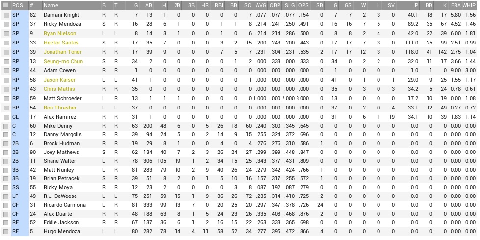 There was another horrendous sub-.400 team from the South, but the overall numbers weren’t quite as grim for the Thunder as they had been for the Falcons. Yeah well, they had the fewest runs scored in the Continental League, but their pitching was almost decent, and they had a really good bullpen. And those least runs scored had a certain factor of being unlucky to them, because they actually weren’t near the bottom of the league in any one major batting category, f.e. they were ninth in average and seventh in home runs. They hit more dingers than the Critters! Those Critters held a 2-1 advantage in the season series. Projected matchups: Ryan Nielson (2-3, 4.73 ERA) vs. Brian Furst (6-9, 5.59 ERA) Hector Santos (6-2, 2.80 ERA) vs. Brendan Teasdale (3-11, 4.94 ERA) Ricky Mendoza (6-5, 4.75 ERA) vs. Jorge Gine (4-6, 3.35 ERA) That’s three more right-handed pitchers to contend with, and so far the chances look also in favor of avoiding the Elks’ C.J. Fishel on the weekend. Like I said earlier, we’re in the 17-game string ahead of the All Star Game. There will be mandatory days of rest as we get closer to the end of this week, except for Nunley and Walter, who had already a day off on the weekend. However, as I’m trying to weave in Ricky Moya to see whether he can bat his weight (which so far is not the case), there might be a few more off days sprinkled around our starting infielders anyway, especially with Joey Mathews swinging a hot stick recently. Game 1 OCT: CF J. Stevenson – 2B Farias – LF Cisneros – 1B Manfull – 3B Ruggeri – SS Janes – C Kizziar – RF Hiscock – P Furst POR: RF Carmona – CF Duarte – SS Walter – 1B H. Mendoza – 2B Mathews – 3B Nunley – LF DeWeese – C Denny – P Nielson Erik Janes livened up a miserable season of batting .211 with no home runs when he dingered off Nielson in the second inning for the first run of the game. Both teams had stranded a man on second base in the first, but no such thing happened in the second inning. The Coons took a 2-1 lead in the bottom 2nd on a pair of solo home runs by Nunley and Denny, and in the bottom of the third their 1-2-3 guys opened with 1-2-3 singles, loading the bases with no outs. Given that Hugo Mendoza came up with another single for an RBI right away, Furst eventually got off easy, retiring Mathews on a foul pop before allowing another run on Nunley’s single to right center. DeWeese struck out, Denny grounded out to short, leaving the score at 4-1. While Nielson struck out the side in the top of the fourth and hit a leadoff double and scored in the bottom of the same inning, we found the 5-1 lead to still be leaving things to be desired. F.e. it was not Nielson-proof. Bill Hiscock hit a leadoff single in the fifth, but Nielson forced him on a bad bunt by Furst. With one out and a runner on first, things collapsed rapidly for Nielson, who plated the first run with another single and a wild pitch, then walked Javy Cisneros, and fell to a bombastic line drive by B.J. Manfull to centerfield that rammed off the wall for a 2-run double. D.J. Ruggeri singled him in to tie the game. Janes’ single led to Nielson eviction, with Wade Davis replacing him and striking out Eric Kizziar to finally end the goddamn inning. In the 5-5 tie, enter Matt Nunley, who led off the bottom of the fifth and ripped another homer to right to give the Coons a new lead, 6-5. The following inning, Furst’s replacement was left-hander Nick Lombardo, who allowed a leadoff single to Cookie, who got forced when Duarte grounded to short. Walter singled, Mendoza walked on four pitches, and the bags were full for Mathews, who was hitless so far in the game. Josh Stephenson caught his drive to deep center, but while it was enough for a sac fly, it was the only run for the Coons in the inning. Nunley walked, and Jackson, hitting for DeWeese, flew out to Stevenson as well. While Wade Davis and Jason Kaiser both logged five scoreless outs against the Thunder, the Coons almost let a leadoff triple by Alex Duarte in the eighth get away. Walter grounded out to third, Mendoza struck out. It took Danny Margolis pinch-hitting for Kaiser in the #5 hole to get the run in with a 2-out single to center. That run came pretty damn close to being worth Margolis’ weight in gold, as while Alex Ramirez retired Stephenson to start the ninth, he then walked Emilio Farias on four pitches and Javy Cisneros hit a HUGE fly to left. Cookie had slotted over after DeWeese’s removal and made a mad dash for it, catching the ball right against the wall. The game ended when Manfull grounded out to Walter at second base. 8-5 Raccoons. Carmona 3-5; Duarte 2-5, 3B, RBI; Walter 3-5, 2B; Margolis (PH) 1-1, RBI; Nunley 3-4, BB, 2 HR, 3 RBI; Davis 1.2 IP, 1 H, 0 R, 0 BB, 1 K, W (1-1); Kaiser 1.2 IP, 0 H, 0 R, 1 BB, 2 K; That rotation… exclude Toner and Santos for a moment, and then you have the staff of a last-place team trying desperately not to fold before August. Nielson and Damani Knight now had matching 5.35 ERA’s, and Mendoza would get a chance to catch up in this very series. The question whether Charlie Cooper would be called up anytime soon was not that hard to answer, the actual question was which of the skunks would be dumped. By the way, did you realize that Alex Ramirez tied for second place in wins on this team? Game 2 OCT: CF J. Stevenson – 2B Farias – LF Cisneros – 1B Manfull – C Parks – RF Struck – 3B Ruggeri – SS Read – P Teasdale POR: RF Carmona – CF Duarte – SS Walter – 1B H. Mendoza – 2B Mathews – 3B Nunley – LF DeWeese – C Denny – P Santos Seven innings of 2-run ball was all I hoped for from Santos, although with Brenda opposing him and that weird thing where former third-rate ex-Raccoons work some unholy magic against the Raccoons years and years and years later could well mean that that would still net the Coons a 2-1 loss. That particular scenario didn’t happen, fortunately, because while S