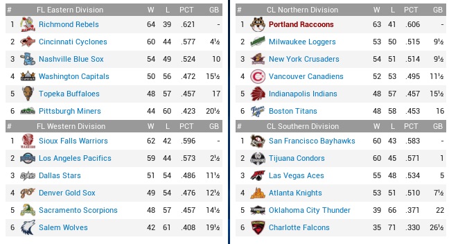 Jose “Dingus” Morales was named MVP of the All Star Game that was played in New York on Tuesday. The Warrior hit two home runs, including a 3-run shot off a certain Jonathan Toner, to plate four in total in the Federal League’s 8-4 win. Toner, the CL starter soaked the loss. Chris Mathis also allowed a run in his appearance, while Thrasher and Ramirez had scoreless innings. Cookie Carmona went hitless as the centerfield starter and batting leadoff, while Hugo Mendoza started in right and batted fifth, going 1-for-2 with an RBI double. Alright, that was shabby, onwards to the second half of the season, please! Raccoons (54-34) vs. Loggers (43-44) – July 12-15, 2018 The Loggers came to town for the back end of the four-and-four that was tradition in the schedule. They were now sixth in runs scored and fifth in runs allowed… not much change there. What had changed however was the edge in the season series. Taking three of four in Milwaukee had put the Raccoons into the lead there, 4-3 over the Loggers as the series began. Projected matchups: Hector Santos (7-4, 2.94 ERA) vs. Ian Prevost (4-6, 3.05 ERA) Damani Knight (4-3, 4.96 ERA) vs. TBD Jonathan Toner (13-3, 2.59 ERA) vs. TBD Ricky Mendoza (7-5, 4.41 ERA) vs. TBD The righty Prevost aside, the Loggers hadn’t made up their mind about the rotation yet. Lefty G.G. Williams (4-5, 3.80 ERA) would pitch on regular rest if going on Friday, and there were also the right-handers Jason McDonald (5-6, 4.81 ERA), Brian Cope (5-4, 3.80 ERA), and Michael Foreman (8-5, 2.20 ERA) in the pool. Foreman had pitched in the All Star Game, but the Loggers would probably not give him four days’ rest, either, just like we did with Jonny Toner. Knight goes second because he will be on regular rest there, and I like to keep disruptions down, and because I want to send Toner no sooner than Saturday while keeping the two biggest holes in the barrel (Knight, Nielson) apart. Nielson was probably worse right now, but I still didn’t know where to get a replacement from. Game 1 MIL: 1B Betancourt – SS Burns – LF LeMoine – 3B Velez – C O. Castillo – RF Coleman – CF Cooper – 2B Krueger – P Prevost POR: RF Carmona – CF Duarte – SS Walter – 1B H. Mendoza – 3B Nunley – 2B Mathews – LF DeWeese – C Denny – P Santos The Coons got off to a blistering start while Prevost got hardly a strike past anybody in the opening inning. Cookie, Duarte, and Walter all had hits to center to start the game, with Cookie already scoring, and Nunley plated two with his 1-out single after Mendoza grounded out to third base. DeWeese added an RBI single for an early 4-spot in support of Santos, who tried to bounce back from the rough wooing he had received by the Titans the previous weekend. After two clean innings he allowed leadoff singles in the third (Gene Krueger) and fourth (Chris LeMoine), but Krueger was starved on third base and LeMoine never reached second, while the Raccoons had doubles by Nunley in the third and Denny in the fourth and didn’t manage to score on those, either. Nunley hit an RBI single in the fifth for an unearned run; Walter had reached second base on Alberto Velez’ 17th error of the season, a gruesome throw past David Betancourt, who came really close to a leadoff jack in the top 6th, but ended up caught on the track by DeWeese, who opened the bottom of the inning with a single to right off reliever Allen Harris. Denny singled to center, after which Santos was to bunt, but ended up safe at first when Betancourt mishandled the ball and was assessed an error for it. Bases loaded, no outs for Cookie, who lined to center, but Andrew Cooper caught the ball, holding him to a sacrifice fly, 6-0. Duarte grounded to third, where Velez tapped the bag to force Denny, but his throw to first was late. Harris got Walter to ground out, but injured himself in the process. Santos only got one more out before getting struck after three singles in the seventh inning, and Cookie already limited the damage, throwing out Velez trying to go first-to-third on Orlando Castillo’s single, the second of the inning. Ian Coleman’s infield single ended Santos’ day after 97 pitches. Kaiser replaced him, struck out Cooper, then yielded for Chun, who got Krueger to ground out. Chun also dealt with the eighth before Matt Schroeder came in for the ninth in a 6-0 game. Castillo singled, Cooper walked, and Krueger ended his scoreless innings parade to start a career at 21.1 frames when he hit a double into the leftfield corner, plating both runners. Brad Gore’s grounder to Mathews ought to have ended the game, but Mathews threw the ball away, plating a third run for the Loggers. Alex Ramirez replaced him and struck out Betancourt to finally end the game… 6-3 Coons. Nunley 3-4, 2B, 3 RBI; DeWeese 2-4, RBI; Denny 2-4, 2B; Santos 6.1 IP, 6 H, 0 R, 0 BB, 7 K, W (8-4); Wade Davis came off the DL in time for the Friday contest. Adam Cowen (5.63 ERA) was sent back to St. Pete. Game 2 MIL: RF Hodgers – SS Burns – CF Gore – LF LeMoine – 3B Velez – C O. Castillo – 1B Betancourt – 2B Krueger – P McDonald POR: RF Carmona – CF Duarte – SS Walter – 1B H. Mendoza – 3B Nunley – C Denny – LF DeWeese – 2B Hudman – P Knight After two scoreless, Knight got into serious trouble when Victor Hodgers hit a leadoff single in the third inning and Shane Walter threw away Kyle Burns’ potential double play grounder. When Brad Gore grounded to Hudman, no double play was turned again with only Burns removed at second base, leaving them on the corners for LeMoine, who also grounded to Hudman rather than killing Knight outright, but again the Coons didn’t turn the double play when Gore mowed down Walter to break it up. Hodgers scored, putting the Loggers up 1-0. When a double play was turned eventually, it was on the Coons in the bottom 4th, Nunley getting Walter removed in a 6-4-3 cleaner. The Coons had only two hits through four innings and fo
