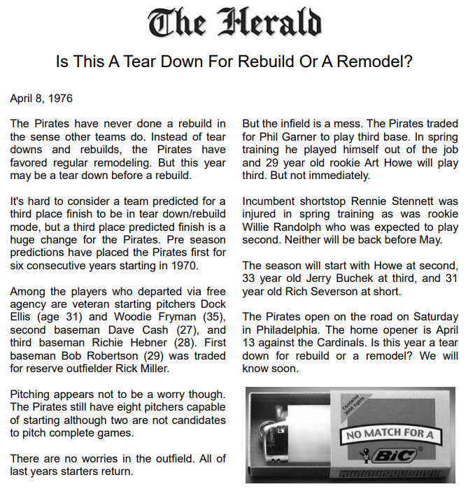 Major Free Agents Losses 2B Dave Cash age 27 3.5 stars making $150k wanted $362k x 8 SP Dock Ellis age 30 2.5 stars making $125k wantdd $150k x3 SP Woodie Fryman age 35 2.5 stars making $95k wanted $260k x 4 3B Richie Hebner age 27 2.5 stars making $160k wanted $240k, + $250k x 2 Trades Shopped AAA SS Frank Taveras age 25 2.5 stars and was offered SS Phil Garner 2.5 stars. My assistant GM said not good enough so got A's to throw in AA 3B Gaylen Pitts age 29 1.5 stars and AA CF Larry Harlow age 23 1.5 stars and completed the trade. Garner will play 3B. Shopped 1B Bob Robertson age 29 2.5 stars and accepted an offer of LF Rick Miller age 27 2.5 stars but can also play CF (what I'm interested in) and RF. |