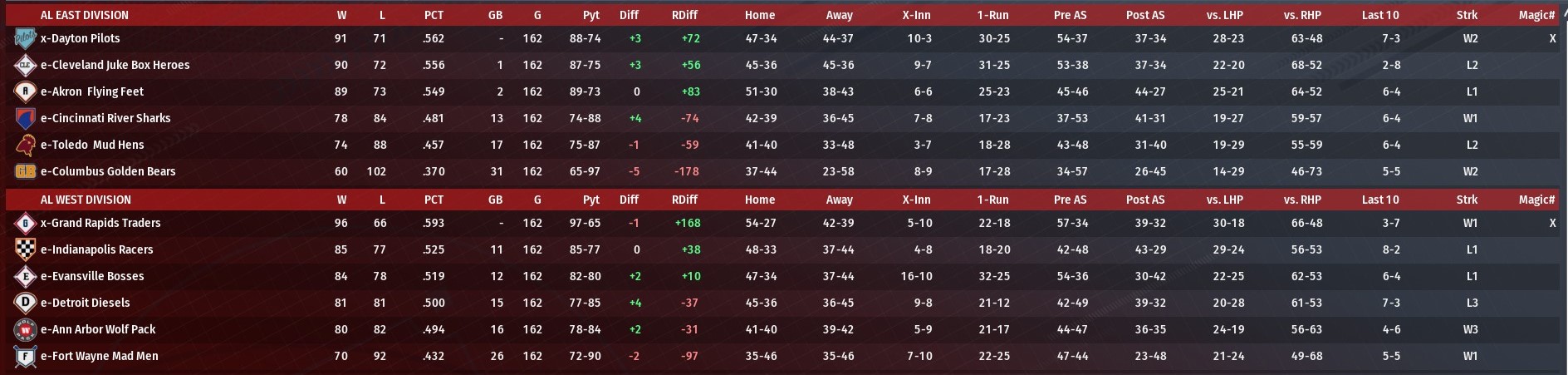The Pilots (91-71) finished with just a one-game advantage over second-place Cleveland. The Juke Box Heroes fell 6-1 in their finale, dropping them out of a first-place tie for the division lead. The playoff berth is Dayton's first since 2018, the inaugural season for the Midwest Baseball League. The Pilots will open the American League championship series on the road against Grand Rapids. The Traders won the AL West Division with a 96-66 record. |