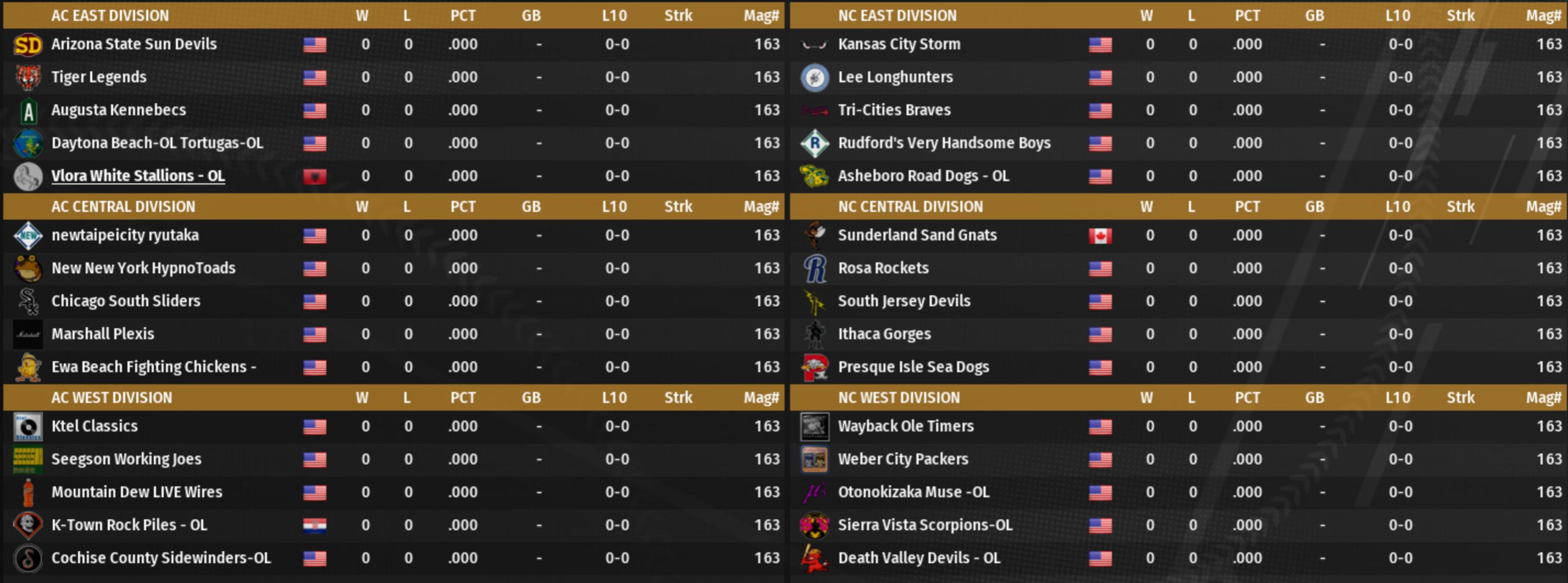 Cary hangs on to claim the OL Gold crown. Overall Cary and Kansas will represent OL in the post season. whole bunch of OL teams heading back to Silver: -El Dorado Aztecs -Hartford Whalers -Hooterville Haymakers -Brooklyn Pimp Ministers -South Side Gooeys -Norwood Red Menace -Brooklyn Dynasty -Shinbone Stars |