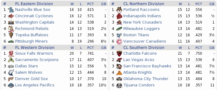The luck ended right that evening. We got news that in an A level game our prospect Juan Martinez had torn his posterior cruciate ligament. He was out for at least nine months. We had signed him right out of Mexico this winter. We played game 2 without Ben Simon, who was a little worn out. Jeffries was in, but Simon pinch hit later in the game, grounding out. He has so far played in every Raccoons game in franchise history. The Raccoons lost 4-2 on poor offense and another shoddy performance by Christopher Powell, who gave up ten hits and all the runs in 4.2 innings. Next guy up with an inability to throw strikes as a recognized disability? Berrios. He walked four, but left a 2-2 tied game, that the Raccoons only lost through a combo of Wally Gaston walking three in the top 9th, combined with an Ed Sullivan error that cost three unearned runs. 5-2 loss. Sullivan deserved a day off along with Maloney, and both saw the Raccoons lose in ten innings, 2-1, with once again four hits. Logan Evans got a no-decision again with one run allowed in seven frames. Now, allowing only 11 runs to the Crusaders over four games, that was certainly not that shabby. Of course, it was almost all bullpen. Berrios and Powell were in a slump, and Evans was walking them in scores. And then the team scored only nine runs themselves, losing three of four. I realize I continue to sing the same song here. But at 36-45 now, the first half of the season was over, and we were 262-329 in runs. That’s actually just over three runs scored per game. We were relying heavily on the long ball, leading the CL in home runs. Almost every other offensive category (including steals with Flores losing his timing): 11th or 12th. Canadiens in Vancouver for four games next. Jorge Romero went six good innings allowing one run and Hoyt Cook later bashed the go ahead home run in the top 9th. Hatfield got his 23rd save in the 2-1 game with an amazing catch by Pedro Sánz to end the game, but then was in pain afterwards. He had a sore shoulder and was out for for one to two weeks. Which was terrible. One week, keep him and play Gaston as closer. Two weeks, disable him. One to two weeks? Gnarf. I thought about disabling him and calling up Brett Justice, but Justice was still struggling after a year on the DL, so I got Ned Ray to replace him in the pen. Gaston would close the next 15 days. There was no save opportunity the next day, when the Raccoons beat the Canadiens 6-2. They only had five hits, but were walked eight times and Ben Simon got the ship righted early with a 2-run slam in the first inning. This was followed by a 7-3 win the next night. Berrios one-hit the Canadiens in five innings, then crumbled in the sixth and couldn’t get out of there. Tony Lopez actually got his first career save, pitching the last two, entering at 5-3, before Flores homered in the top 9th. Flores, Sullivan, and Simon all had three hits. Maybe things were just slightly coming around. The Raccoons finished the four games in Vancouver with a sweep, rapping Canadiens starter Vic Underwood hard for seven runs in four innings, winning it 9-2. Logan Evans: 6.0 IP, 5 H, 1 R, 0 BB, 5 K. The kid was sometimes erratic, but this was a stellar outing for him. A warm wind was blowing through the clubhouse. Rapping the Canadiens by 24-8 runs and sweeping them in four had helped a lot to rebuild lost confidence. Sure, we had temporarily lost our closer, but the good thing was that the All Star break was up – three off days either way. Of course, it was bad for Hatfield, who, leading the ABL in saves, might have had a shot at a selection. Only the Titans left for three in Boston before the Federal League and Continental League would match up. A few guys got a day off to start the series, with Pickett and Jeffries in for Flores and Swift. Jorge Romero went the distance in game 1 as the troubled Titans pitchers were rolled up by the Raccoons, 8-1. Everything went right out of whack again from there. Boston’s Sean Critch shut down the Raccoons, while Christopher Powell continued to throw like a girl. Six runs in two plus innings, that guy was about to get shafted. Raccoons lost 9-0. Game 3 was more of the same with a 6-1 loss. Raccoons were fanned nine times and Berrios pitched five scoreless before melting down epically in the sixth. Ben Simon was the only Raccoon nominated for the All Star game. The Continental League won 3-0. Simon played the whole game at shortstop, but went 1-4 with 2 K’s. Break over, back to business. At 41-47 and very erratic play this meant to try to optimize the lineup. Dolder was out, batting below .200 and not getting plays in several times against Boston. Pickett was in CF against the Canadiens, in another four game series, this time at home. Logan Evans started the series at home and allowed two runs in the first inning. He then settled in, but the Raccoons didn’t score for him and only got moving in the bottom 8th with three runs scored by the bottom of the lineup. Gaston got his first save in place of Hatfield (second overall this season) in the 4-2 win, but walked two again – this was why he was not the normal closer for the team. Lack of control. Next game, lack of everything in a 4-1 loss. Once again only four hits, a common theme this summer. Game 3. Powell was given a 1-0 lead, but blew it. The Raccoons trailed 3-1 in the bottom 8th, with the bottom of the lineup loading the bases, and nobody out. Flores flew out, Sullivan flew out, Sánz singled in one, Simon flew out. It was both pathetic and embarassing. They loaded the bases AGAIN in the bottom 9th with one out and didn’t score at all, Johnston was thrown out at home while trying. For crying out loud!! They put up at least one strong inning in the last game for a 4-1 win and a tied series. In other news: July 2 – Harry Beauman (.314, 6 HR, 34 RBI) of the Pacifics is out for six weeks with a fractured rib. July 4 – The Indians trade Jorge Vallejo (9-8, 2.99 ERA) to L
