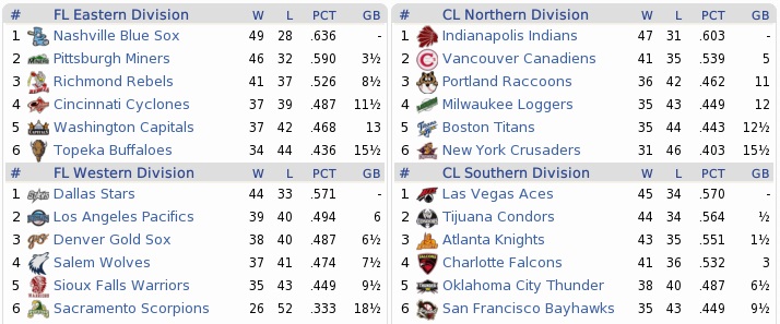 I heard, in basketball the scores tend to be a bit higher than in baseball. Is that actually true? ----- On the field, we had three more series before the All Star Game, including consecutive 4-sets on the East Coast, and then three at home against the #1 in our division. Yay, looking forward… Raccoons (36-42) @ Crusaders (31-46) Game 1. Logan Evans and Francisco Vidrio were two lefties just over 3.50 in ERA, but they performed on opposite ends of the scale. Evans settled in after a shaky (and almost catastrophic) first inning, while Vidrio was bombed for six runs through four. Evans held the 6-1 lead through seven innings, going out with a K to Raúl Castillo. Cunningham and Jones both were shaky in their innings late in the game, but the Crusaders came up short both times. 6-1 Raccoons. Hall 3-4, BB, 2B, RBI; Dawson 2-4, 2B, RBI; Evans 7.0 IP, 6 H, 1 R, 1 ER, 2 BB, 3 K, W (6-7); Kisho Saito went in game 2. While the Raccoons blew all their chances to score early, Saito was perfect into the fourth, until Mark Dawson’s error put the first Crusader on. Saito then walked two straight and finally surrendered a long 2-run single to left. Mark Dawson momentarily tied it with a huge home run in the fifth, but Saito fell behind again the same inning after a wild pitch moved a runner to third and he scored on a the next single. In the top 6th, Sergio Martinez hit a leadoff double and with one out, Kisho Saito hit an infield single. Thompson tied the game with a 2-out single, but they left two more on, and Saito fell behind yet again in the bottom 6th. The Crusaders dropped good chances to score against the bullpen, while the Raccoons didn’t get anybody up in the late innings. 4-3 Crusaders. Thompson 2-5, RBI; Dawson 3-4, 2 RBI; S. Martinez 2-4, 2 2B; David Vinson had played the last two games, had not even remotely made contact, and was demoted to AAA, batting .190 now. Andy Reed was called up for a last hurrah. Jason Turner made his second start in the third game, pitching behind in the count almost all the time. For that, he evaded heavy damage a long time. The Raccoons first put a 4-spot (three earned) on Travis Newton in the third, and led 5-0 after four. The Crusaders scored one run in the sixth on equal parts uncontrolled tossing and Dadswell being unable to stop merely decent base stealer Pedro Villa from going from second to third (which he did for the second time in the series). That was all the Crusaders put on Turner, despite being walked five times. The bullpen held up and the Coons added two in the ninth for a 7-1 win. Thompson 2-5; Osanai 2-3, RBI; Perez 1-2, RBI; Game 4 was Andy Reed’s first in the Bigs since 1985, and he started off by working hard to break a 1-0 lead to Scott Wade in the bottom 2nd, throwing wildly for an error on a steal attempt. Wade was able to wiggle through the mess still ahead. Through seven innings, the Raccoons had merely two hits against Yasuhiko Eida, and Wade did what he could. Great help on defense came from Glenn Johnston, Daniel Hall, and Mark Dawson, who if not hitting, at least all made great inning-ending plays with men in scoring position. Eida finally came apart in the eighth. Kelly Weber singled to start the inning, but with two out was still only on second. Daniel Hall drove him in with a single, and the Coons soon loaded the bags drawing walks. They scored two, leaving the bags full. Wade also ran out of steam, unable to get the final out in the eighth. One run scored and the tying run came to the plate. Ed King came in to face the lefty Edward Snyder. A passed ball on Reed didn’t make things easier. The next pitch was wild, the runner scored, and then Snyder doubled. I had enough, King and Reed were both removed from the game. Too late. Cunningham gave up the game-tying double to Diego Rodriguez. One out in the top 9th, two walks and a single filled the bags with Brownshirts. Winston Thompson, the greatest walker of them all, came up. He walked, and Osanai added a 2-out 3-run double. 7-3 Raccoons, a win tainted by inability. Thompson 0-2, 3 BB, RBI; Weber 3-4, RBI; Wade 7.2 IP, 5 H, 2 R, 1 ER, 0 BB, 4 K; The last at-bat heroic by Osanai just in time extended a blossoming hitting streak to 13 games. Raccoons (39-43) @ Titans (39-44) Alejandro Venegas and Bob MacGruder went up in the opener, two pitchers with 5+ ERA’s, who to everybody’s surprise traded zeroes for a while. The Raccoons squeezed in one run on a sac fly by Dawson in the top 4th, then had two on with Venegas batting and nobody out in the fifth. Venegas bunted up the left foul line, and 3B Kelly Carpenter blew the play, everybody was safe. Thompson came through with a 2-run double and Jose Sanchez scored another run with a groundout, 4-0. Of course, Venegas collapsed the instant he came out for the bottom 5th, tumbled into the sixth, but was removed there. Hall made a monster play to collect the final out there, holding on to a 4-3 lead. Dawson upped it with a solo shot in the seventh, and the bullpen almost blew the 5-3 lead in the bottom 8th. Cunningham held on to it with two runners in scoring position already. West pitched a perfect ninth. 5-3 Raccoons. Thompson 2-4, 2B, BB, 2 RBI; Hall 2-5; Johnston 2-4; Dadswell 2-4, 2B; Osanai’s hitting streak ended here, being blanked out, 0-4. In Jorge Valdes (12-1, 2.11 ERA) the Raccoons would have a tough nut to crack in the second game. Logan Evans held the game at 1-1 through four, and Valdes was removed in the fifth due to viciously ill control elevating his pitch count quickly. Four walks and two nicked batsmen were included in the package. Evans contributed equally well at the plate, going 3-3, including driving in two runs in the fifth. In the bottom 5th, he left with an injury. Shock. Juan Martinez and Bentley went long ways in relief and held on to a 6-2 win, but an injury to Logan Evans would foil our plans in plenty of ways. Osanai 4-5, 3B, 2B, RBI; Perez 2-5, 3B, 2B, RBI; Evans 4.1 IP, 4 H, 1 R, 1 ER, 1 BB, 